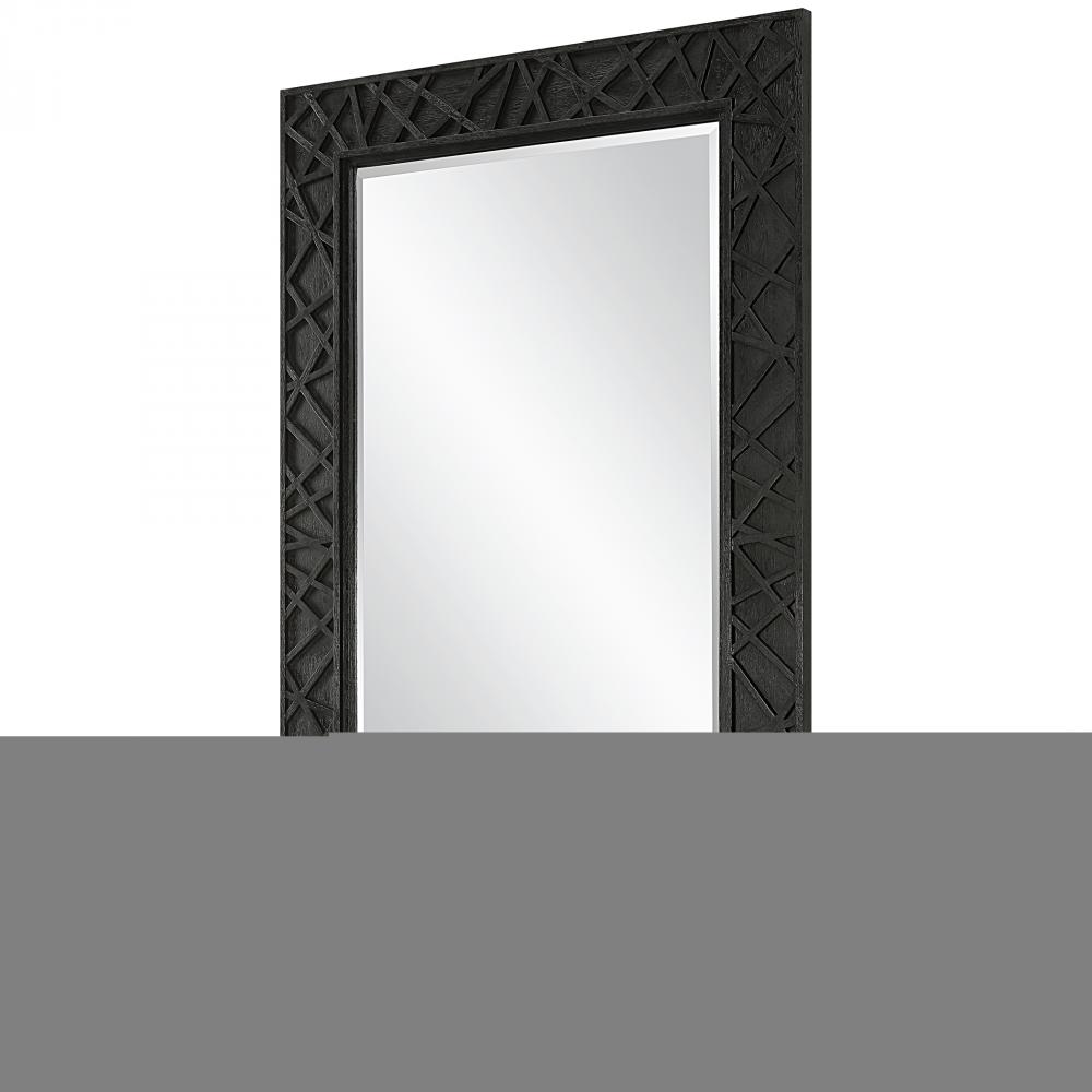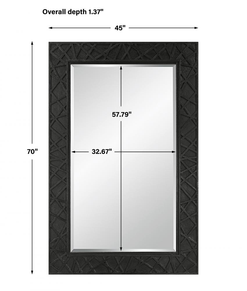 Sure to Make A Statement in Any Space, This Oversized Mirror Sports A Wood Frame with Raised Geometric Details, Finished in A Satin Black. Mirror Has A Generous 1 1/4" Bevel and May Be Hung Horizontal or Vertical.