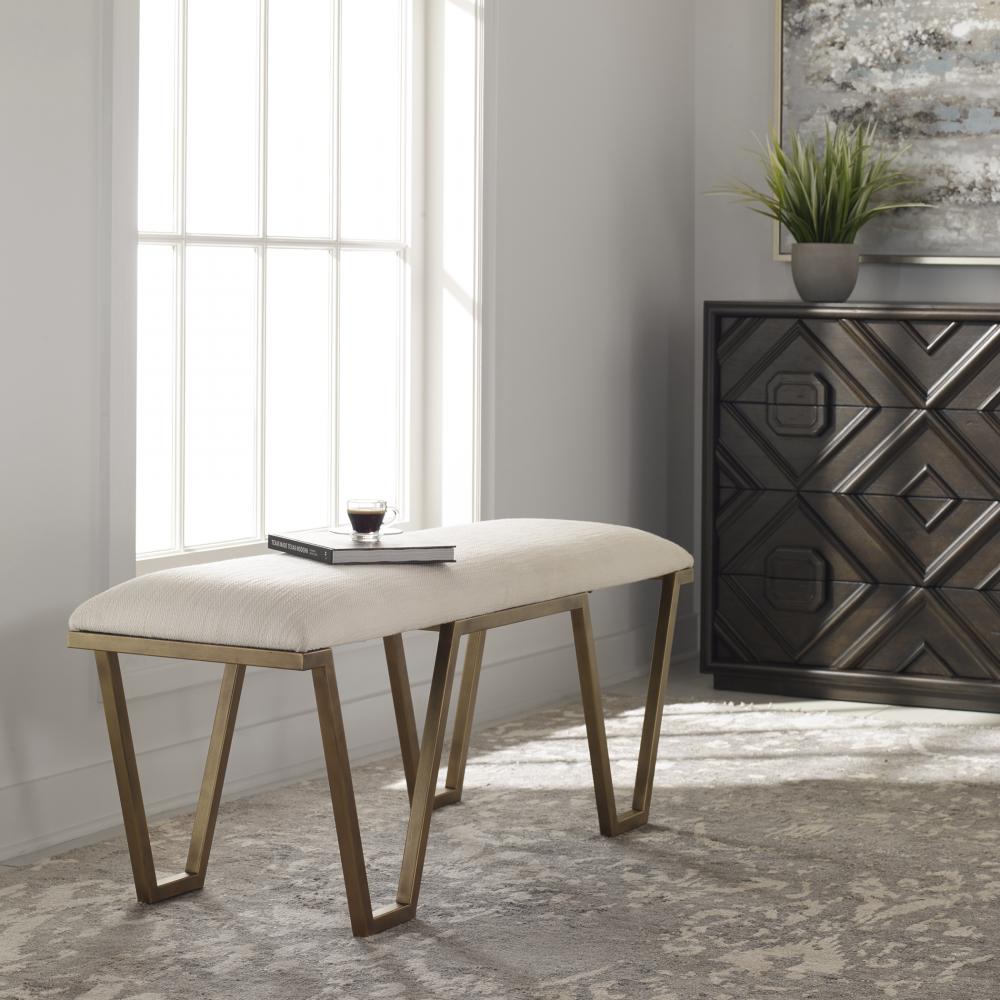 Classic and Sophisticated, This Accent Bench Features A Geometric Iron Base in Antique Gold Leaf with An Upholstered Seat in A Crisp White Textured Fabric.