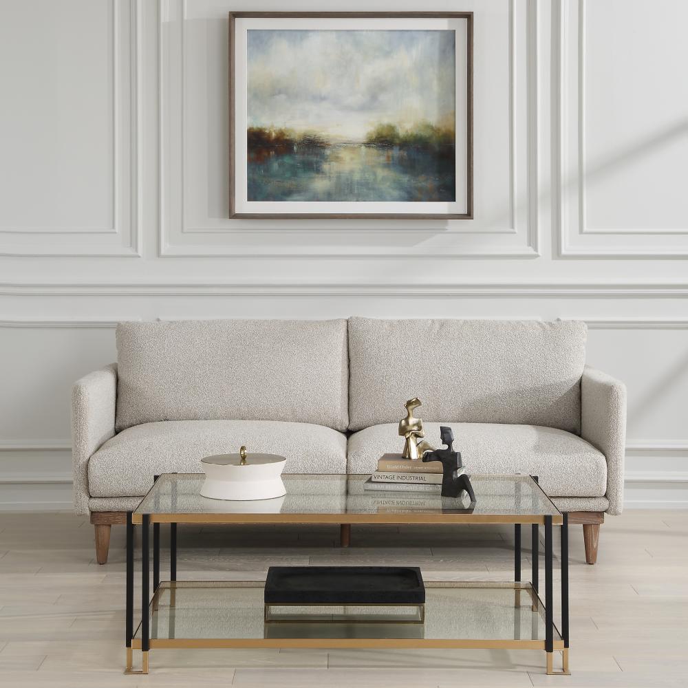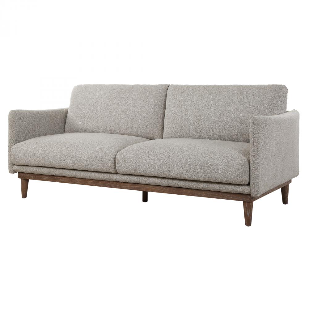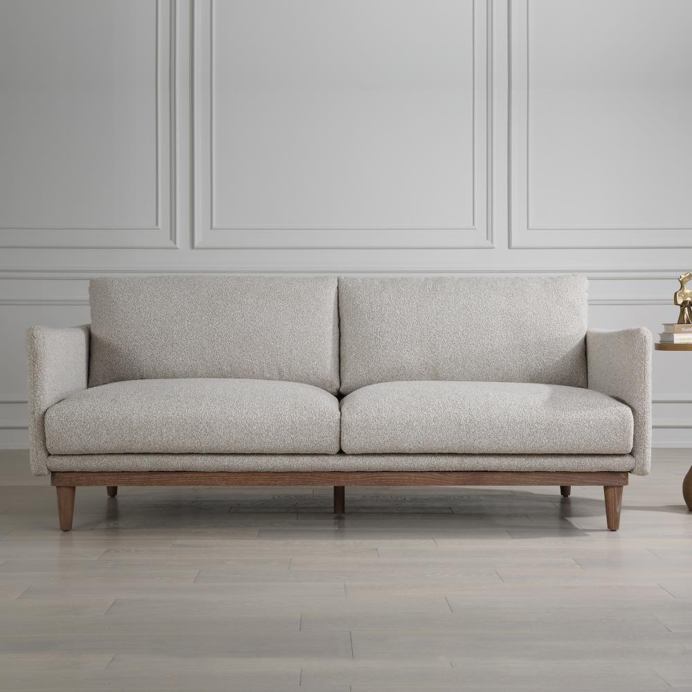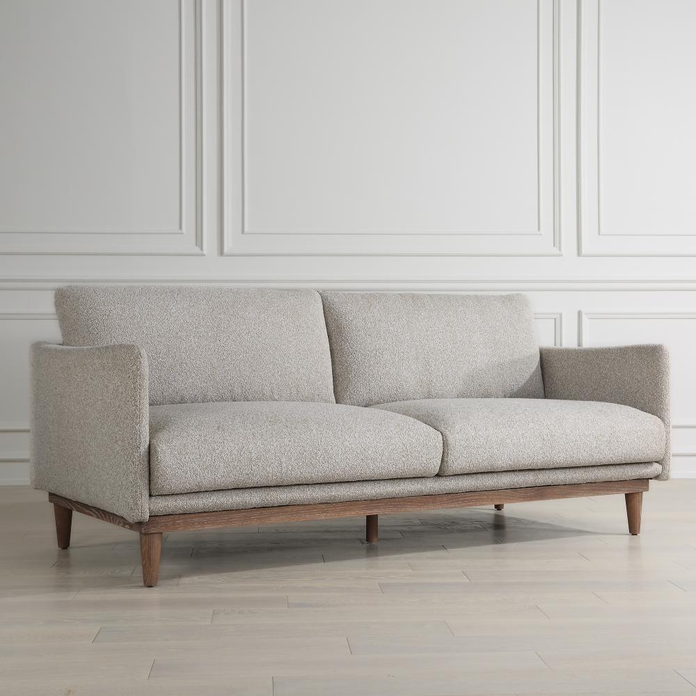 Relax In The Sink-in Comfort Of The Freefall Sofa. Featuring Clean Modern Lines And Resting On A Solid Oak Base In Walnut With Gray Ceruse. High Density Foam Cushions Are Dacron Wrapped And Upholstered In A Warm Toasty Beige Polyester Boucle. Seat Height Is 18".