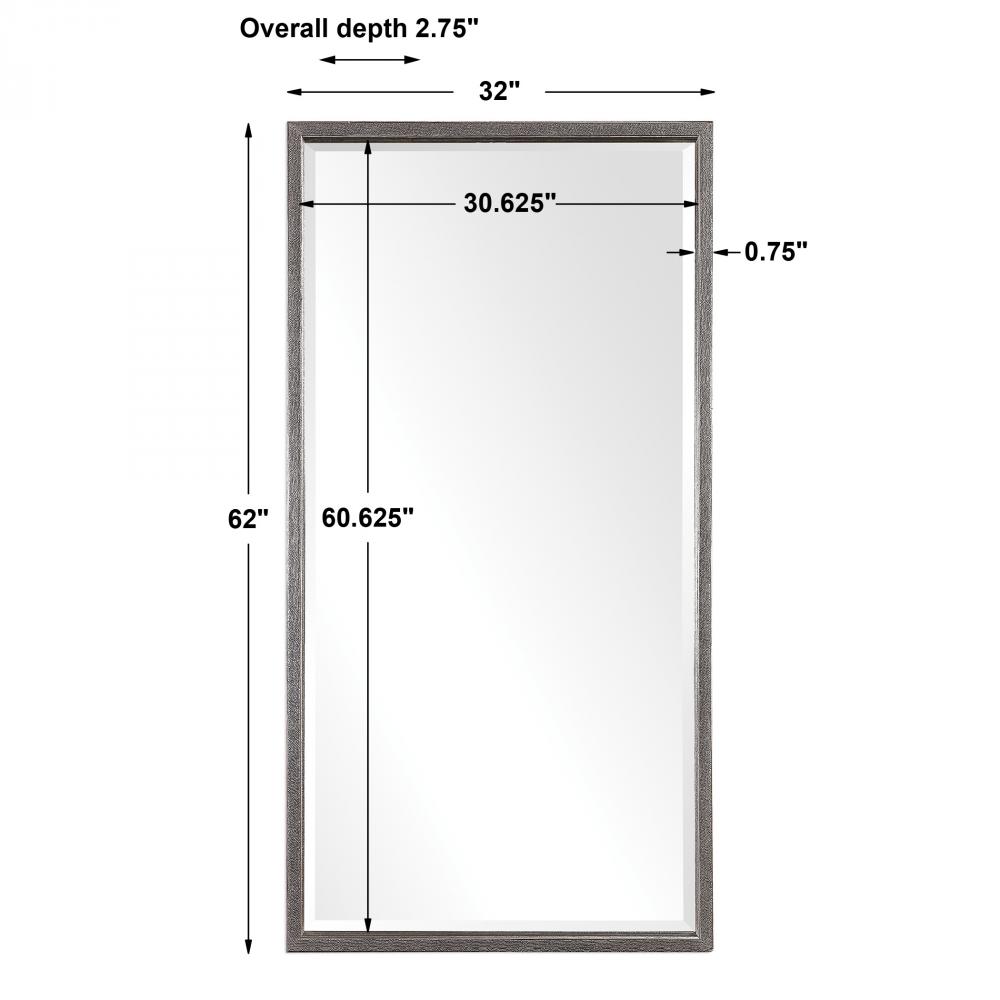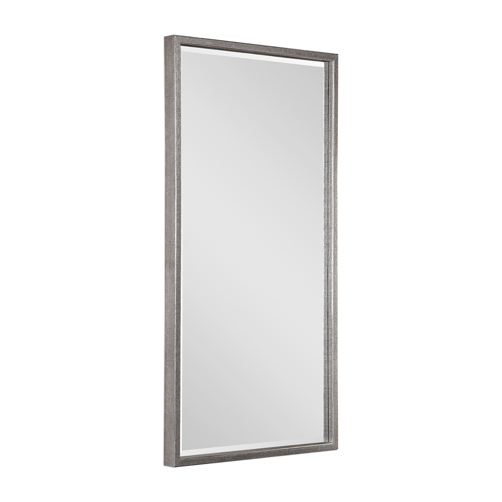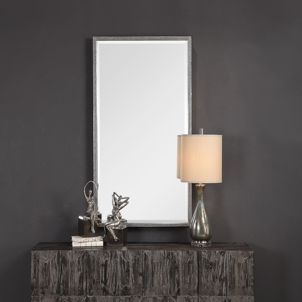 This Contemporary Design Features A Hammered Texture on All Sides Over A Linear Profile, Finished in A Lightly Antiqued Metallic Silver. Mirror Features A Generous 1 1/4" Bevel and May Be Hung Horizontal or Vertical.