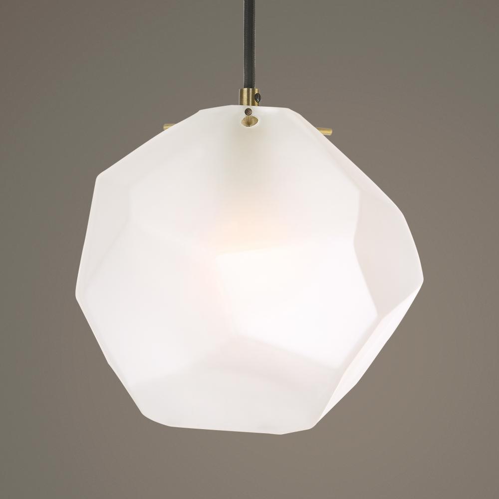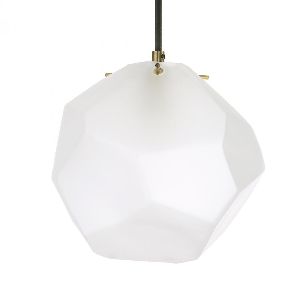 Frosted 8" Geometric Shaped Glass Gives Us The Focal Point for This Celestial Feeling 1 Lt. Pendant Accented with A Rich Matte Antique Brass Finish. 1-60 Watt Max Candelabra Socket. Bulb Not Included. Supplied with 15' of Black Fabric Covered Wire for Adjustable Installation.