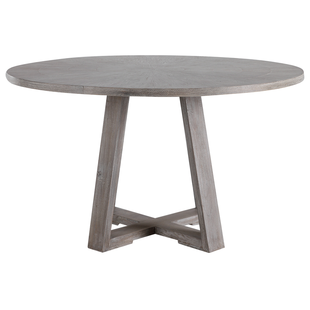 With Clean Casual Styling, This Dining Table Features A Richly Grained Oak Veneer Inlaid Top Finished in A Soft Gray with Hints of Brown Undertones, Atop A Sturdy Elm Wood Trestle Base. Solid Wood Will Continue to Move with Temperature and Humidity Changes, Which Can Result in Cracks and Uneven Surfaces, Adding to Its Authenticity and Character.