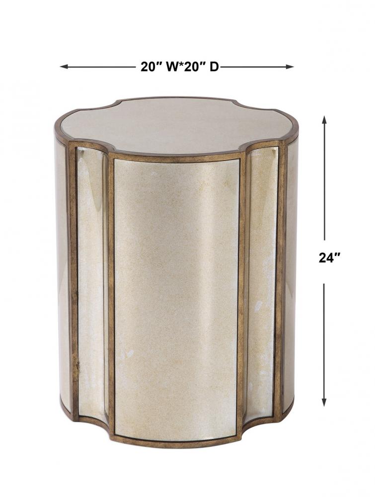 Add Unique Style to A Space with This Quatrefoil Designed Accent Table. Each Facet Features A Curved Antique Mirror Surround, Accented with Antique Brass Finished Framework.