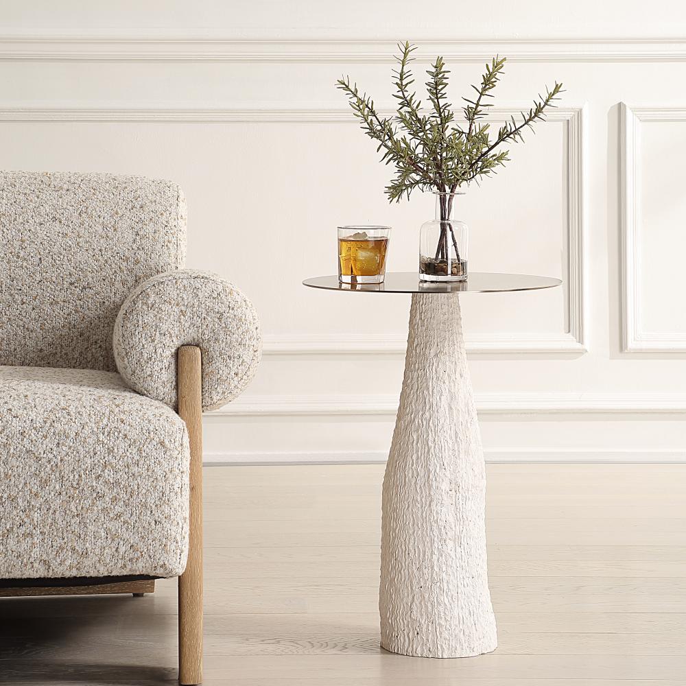 The Accent Table Features A Uniquely Shaped Base Crafted From White Cast Stone, Showcasing A Beautiful Quarried Stone Texture That Adds Depth And Character. Topping It Off Is A Sleek Brushed Metal Surface, Creating A Striking Contrast That Enhances The Table's Contemporary Appeal.