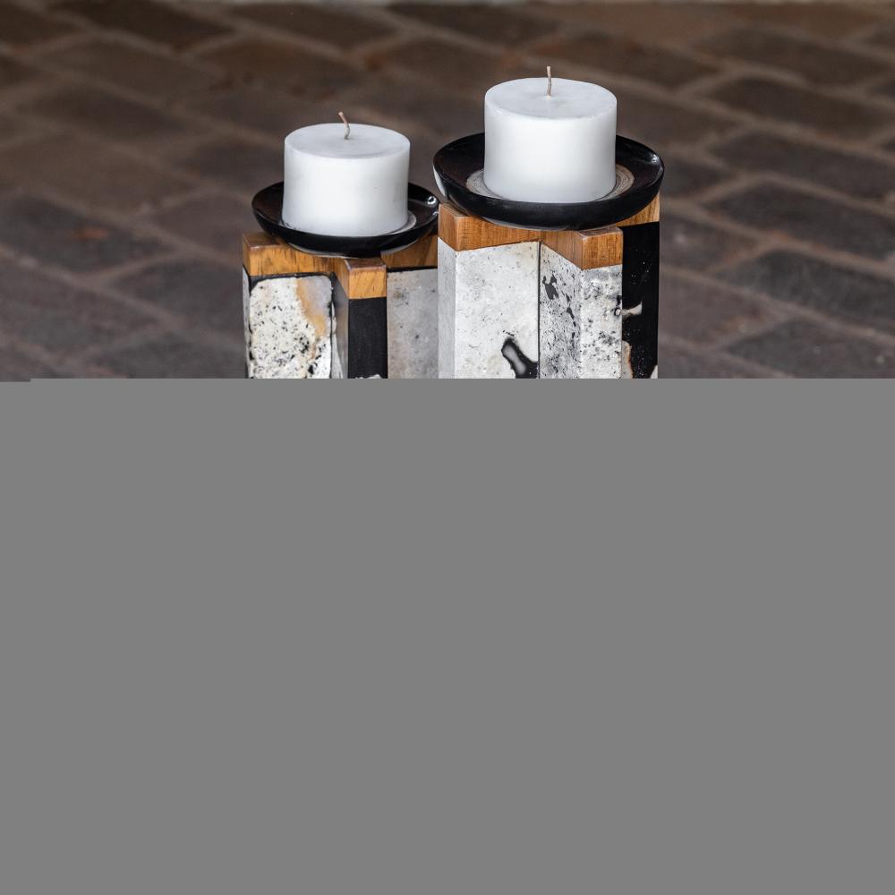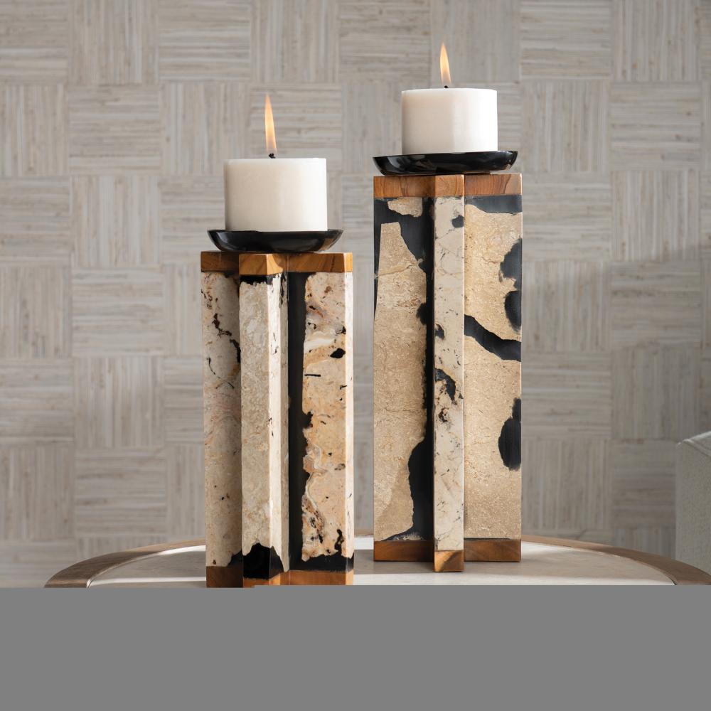 Set of Two Candleholders Feature Natural Coral Stone Bases with Teak Wood and Aged Black Accents. Two 3"x 3" White Candles Included. Sizes: S-5x13x5, L-6x16x6