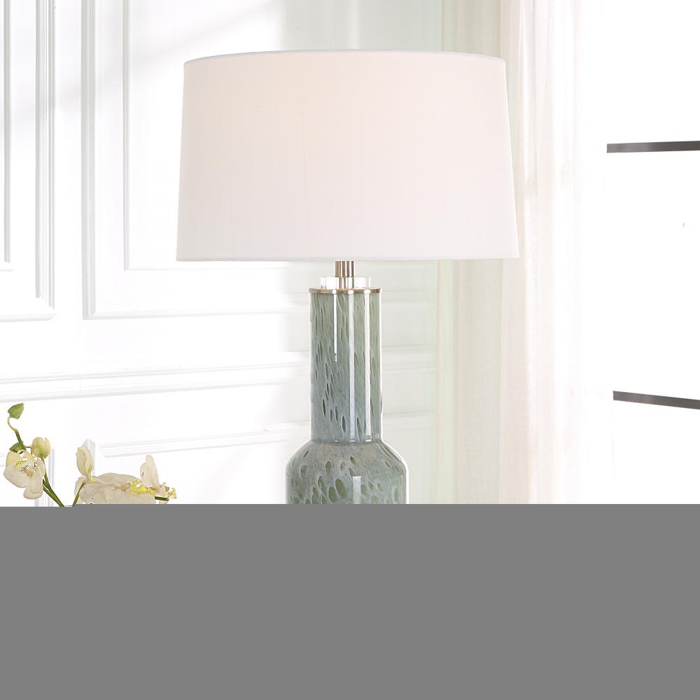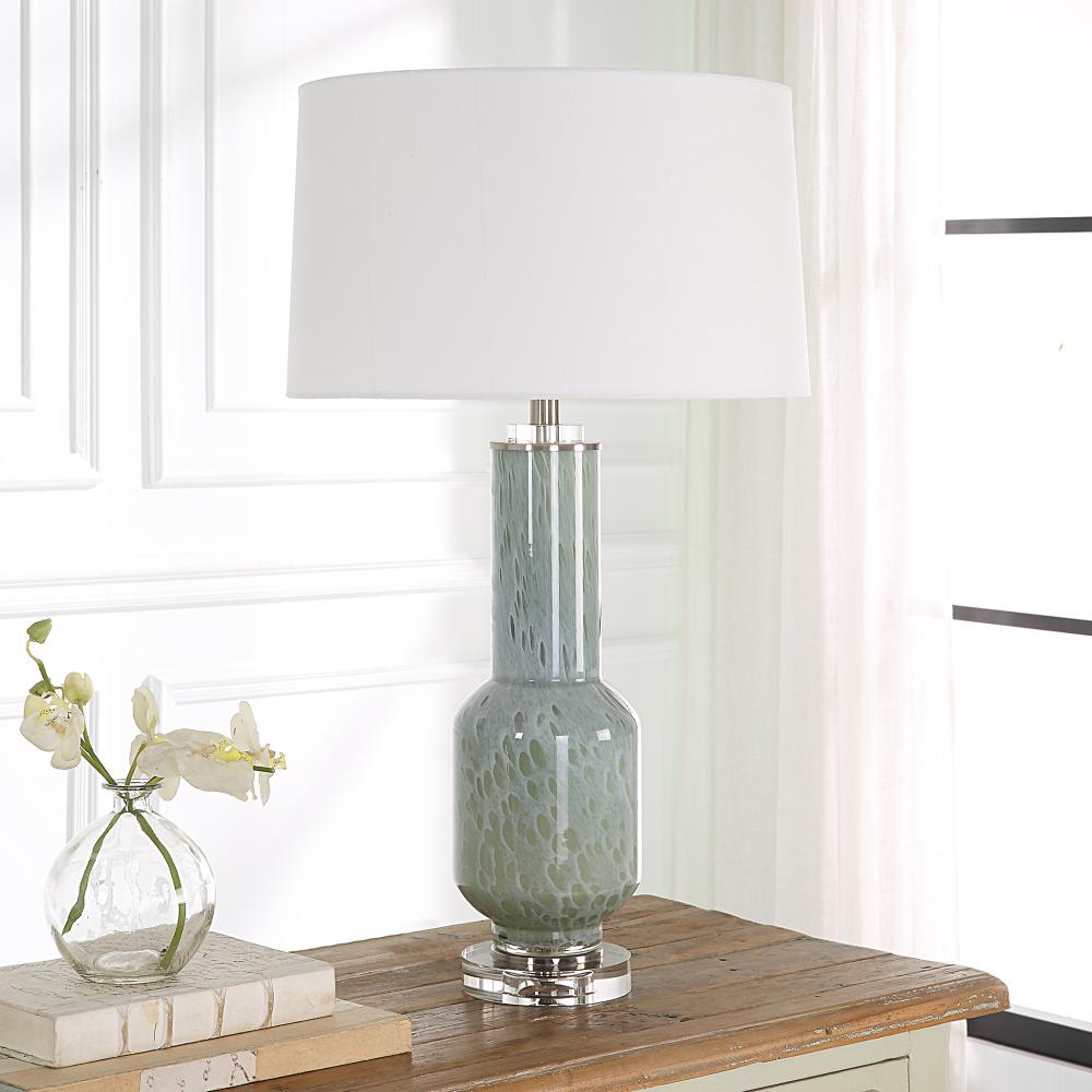 This Sophisticated Lamp Displays A Unique Bubble Glass Base in Tranquil Aqua Gray with Plated Brushed Nickel Accents and Thick Crystal Details. Tapered Hardback Shade is Covered in A Crisp White Linen Fabric.