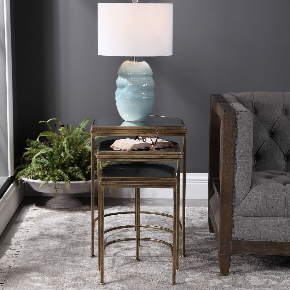 Set of Three Nesting Tables with An Elegantly Curved Hand Forged Iron Frame, Finished in Antique Brushed Gold with Beveled Mirror Tops. Sizes: Sm-13x13x18, Med-15x16x21, Lg-18x19x24