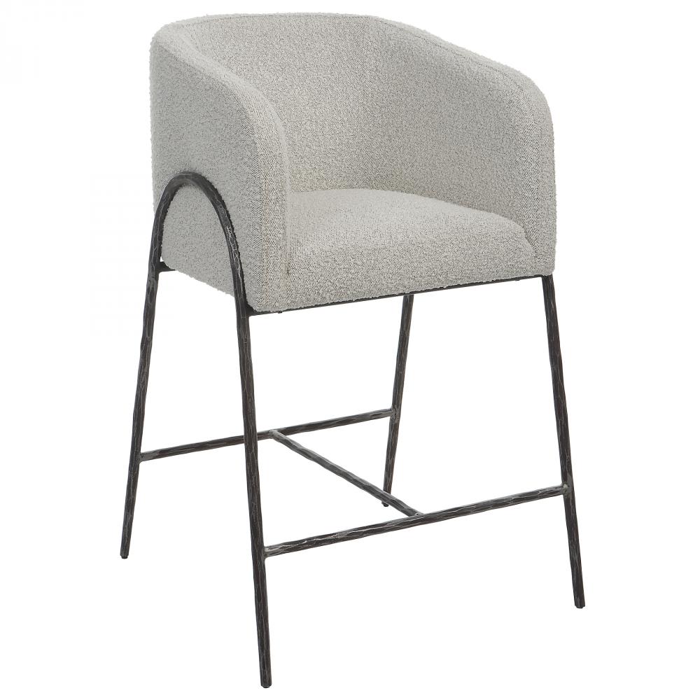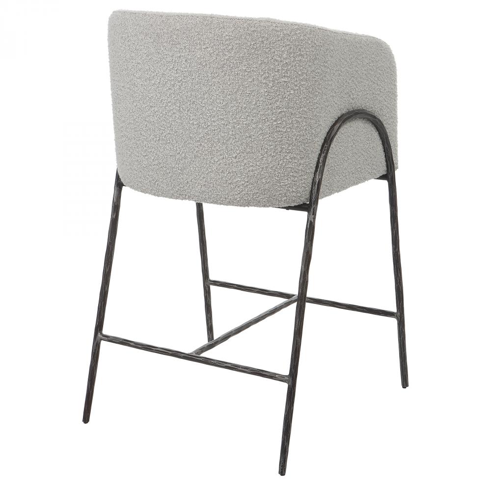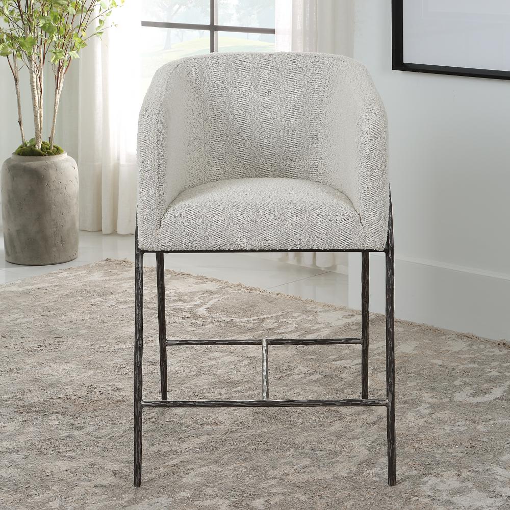 Inspired By Scandinavian Designs, This Barrel Back Counter Stool Showcases A Chiseled Iron Frame in A Natural Aged Black Iron Finish. A Casual Ivory and Warm Gray Boucle Performance Fabric Accents This Modern Look. Seat Height is 27".