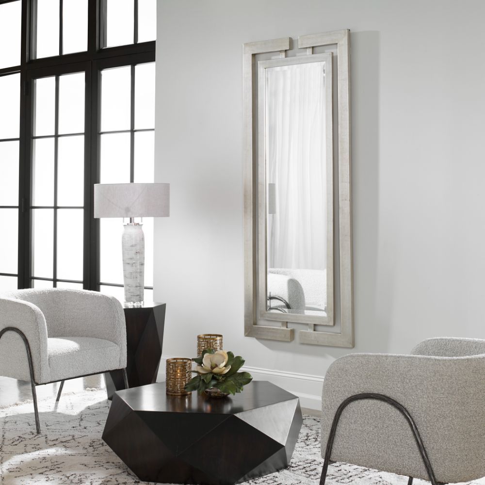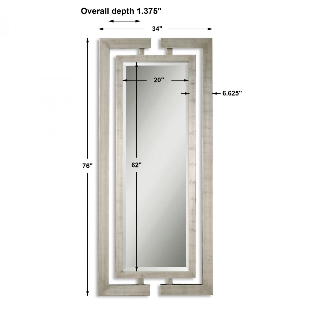 This Stately Mirror Features Dual Wooden Frames Attached At The Top and Bottom with A Scratched Silver Leaf Finish. Frames Have Open Detail for Wall Color to Show Through. Mirror Has A Generous 1 1/4" Bevel and May Be Hung Horizontal or Vertical.