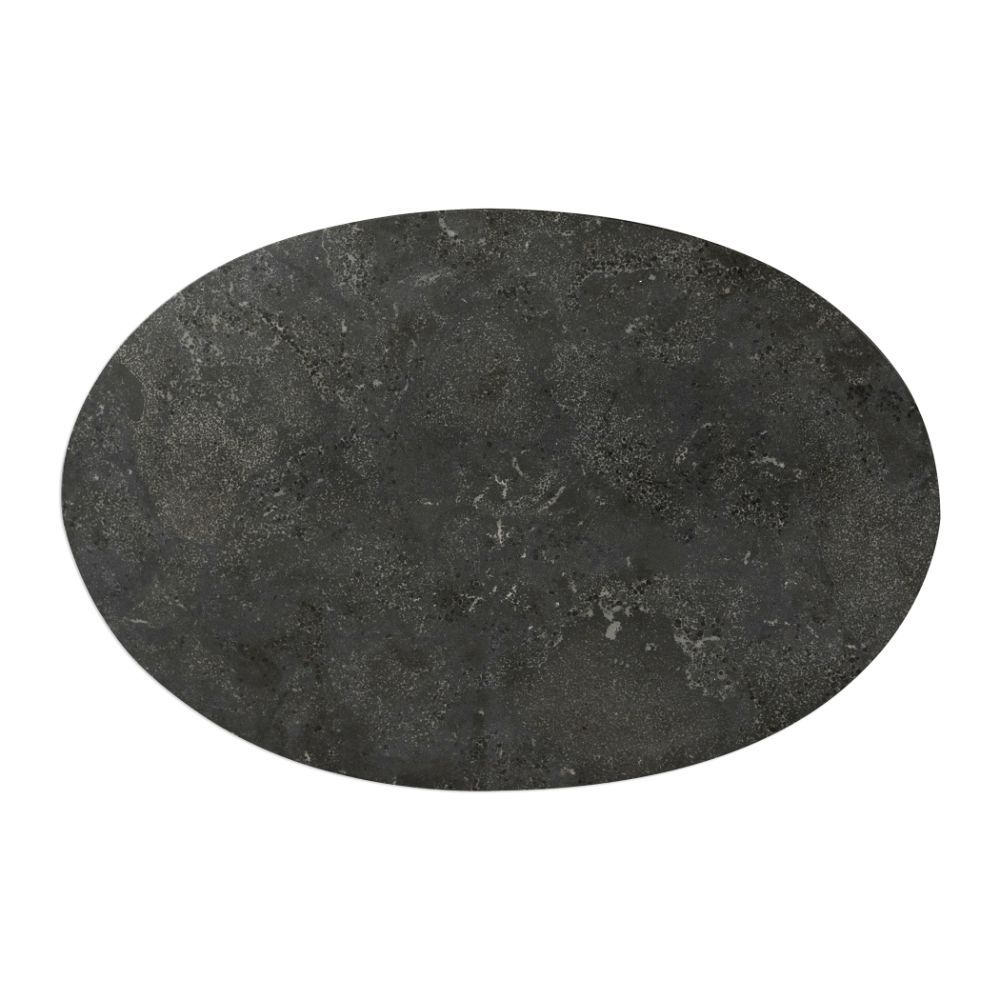 Showcasing A Clean-lined Design, This Accent Table Features An Inset Oval-shaped Polished Bluestone Top with Natural Characteristics of White Marbling and Veining Throughout, Supported with A Hand Forged Iron Base Finished in Heavily Antiqued Brushed Gold.
