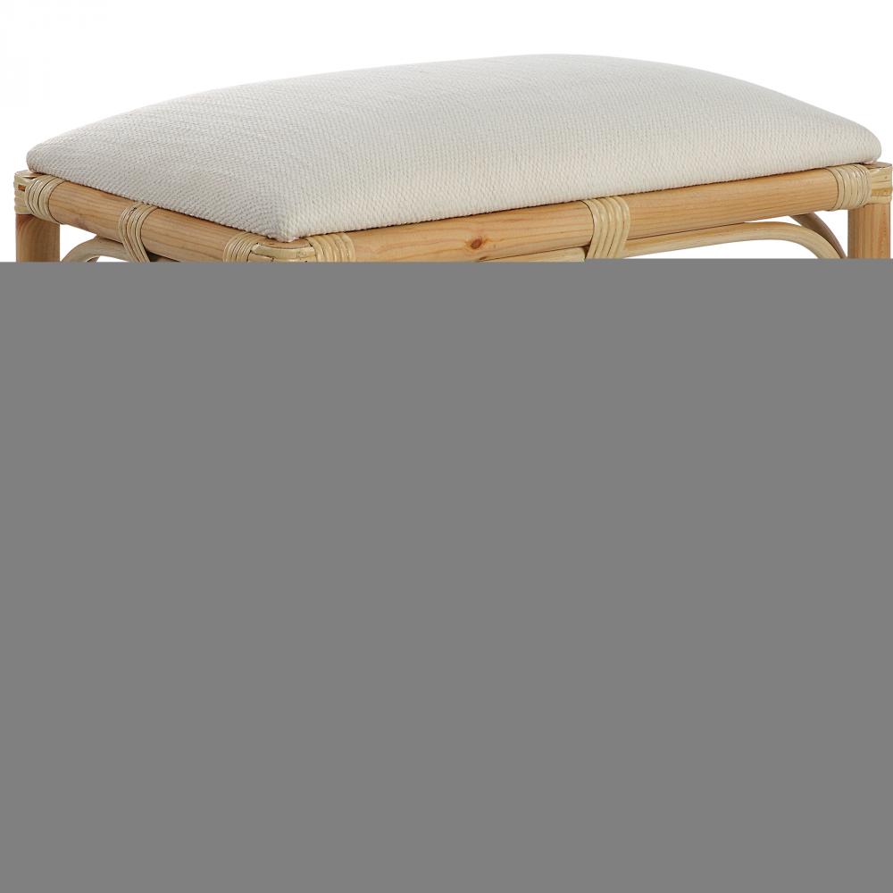 A Refreshing Coastal Accent Featuring A Crisp White Textured Fabric, Over A Naturally Finished Solid Wood Base with Rattan Wrapped Accents. Perfect Doubled Up At The Foot of A Bed or Under A Console Table.