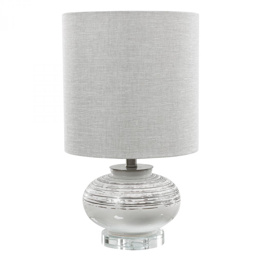 Inspired By The Bark of A Birch Tree, This Accent Lamp Features A Ceramic Base Finished in Off-white with Dark Bronze Accents and Noticeable Texture and Distressing. The Piece Also Has A Crystal Foot and Brushed Nickel Details. The Lamp is Paired with A Light Oatmeal Linen Fabric Shade.