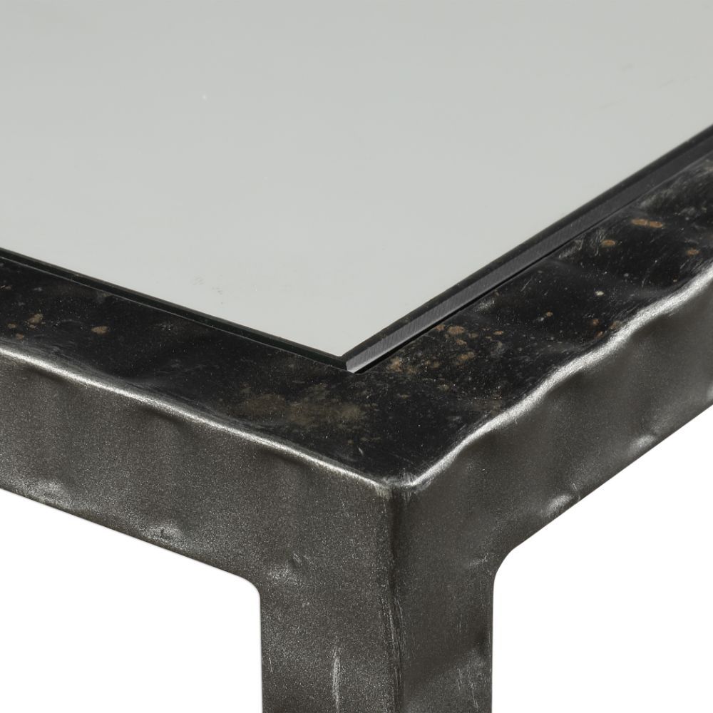 Industrial Inspired Function with Multi-level Display Shelves, Featuring Ribbed Iron Finished in An Aged Gunmetal with A Light Rust Patina. Shelves Are Clear Tempered Glass.