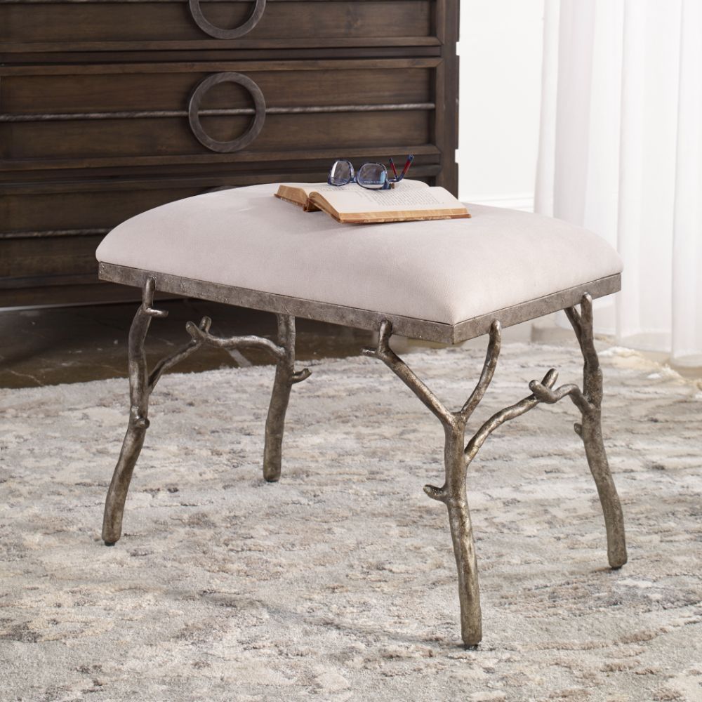 Make A Whimsical Statement with This Molded Branch Accent Bench Featuring A Heavily Textured Antique Silver Finish, Tailored in An Off-white Polyester Fabric.