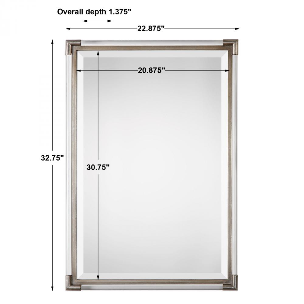Clear Acrylic Rods Surrounding A Metallic Silver Leafed Metal Frame, Creating A Simple, Yet Elegant Mirror Piece That Adds A Taste of Contemporary to Any Room. Mirror is Beveled and May Be Hung Horizontal or Vertical.