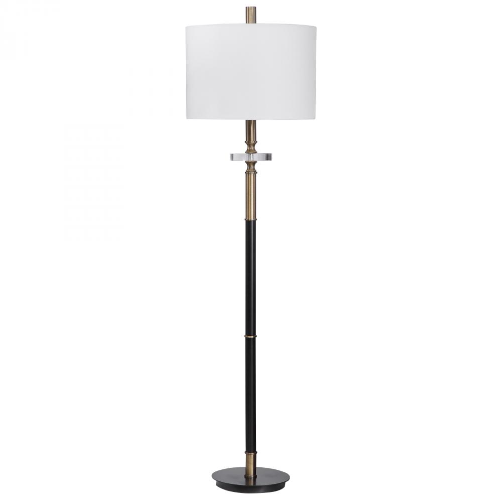 Traditional Elegance is Showcased in This Floor Lamp, Finished in An Aged Black with Antique Brass Plated Accents and A Thick Crystal Ornament. The Round Hardback Drum Shade is A White Linen Fabric.