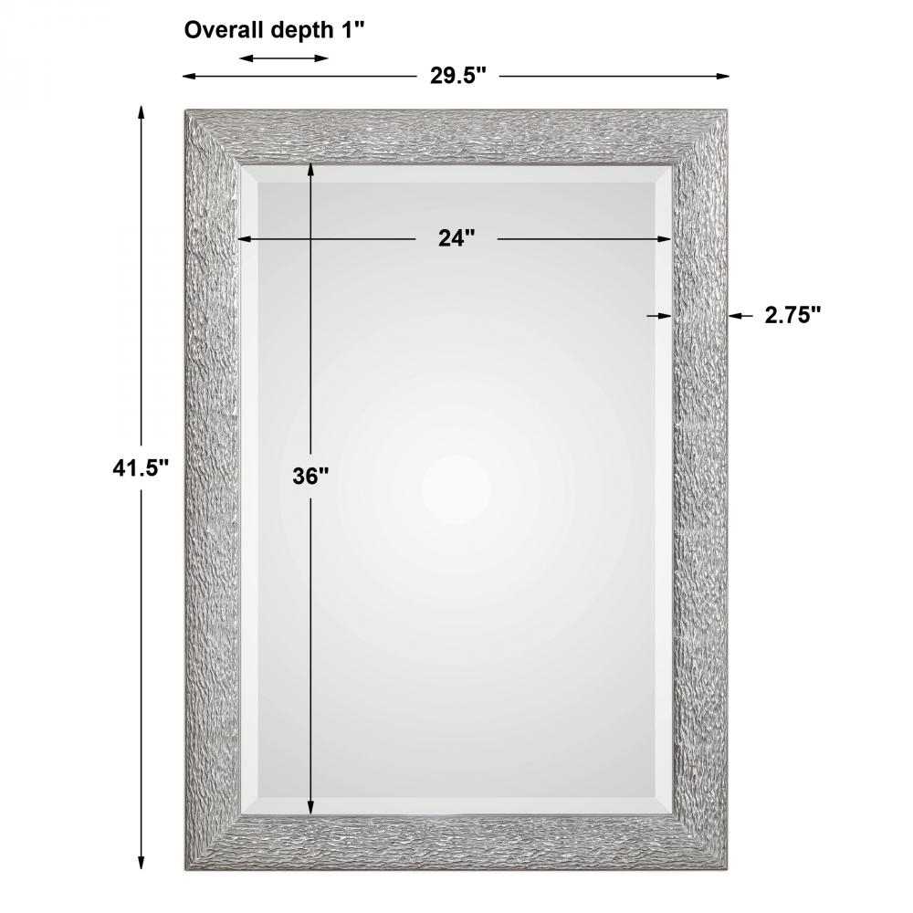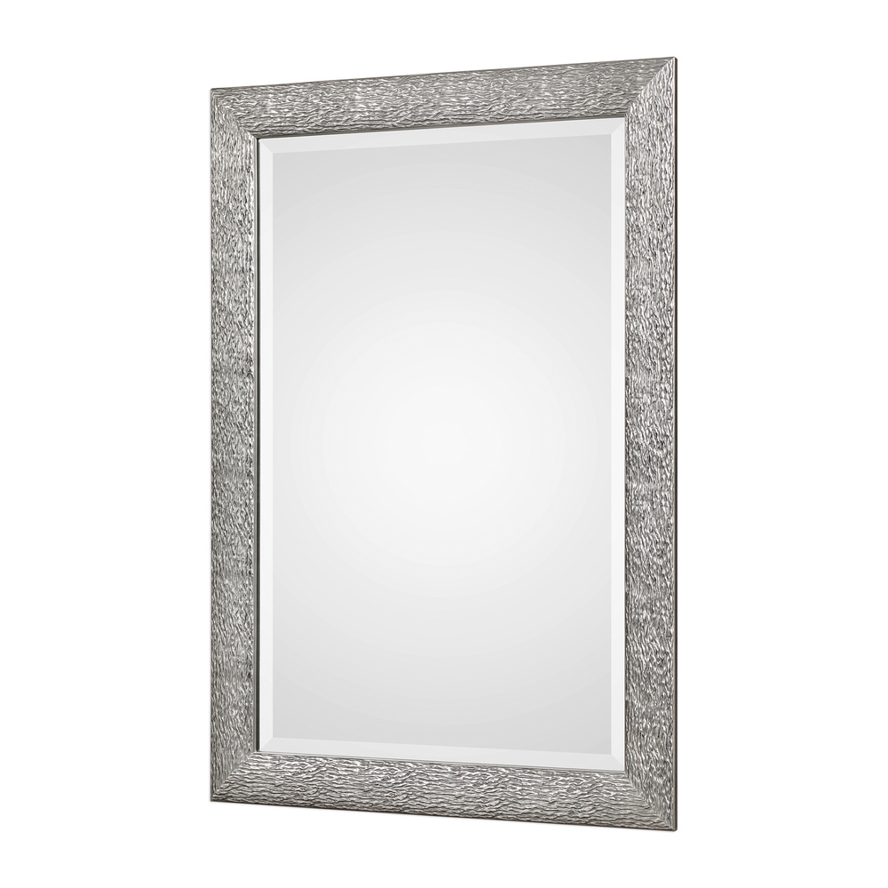 Solid Wood Frame Featuring An Embossed Wavy Texture, Finished in A Metallic Silver with A Light Gray Wash. Mirror Features A Generous 1 1/4" Bevel and May Be Hung Horizontal or Vertical.
