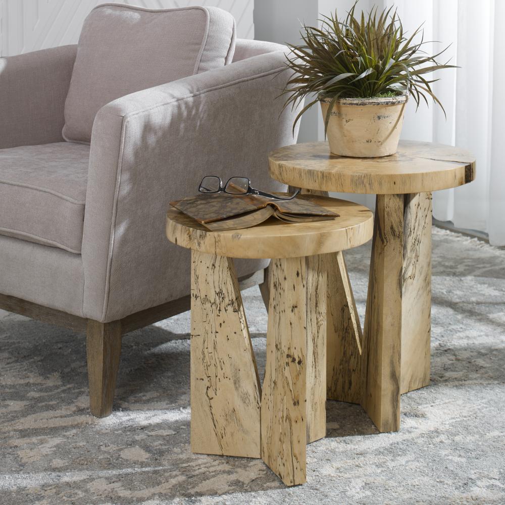 Made From Solid Tamarind Wood, This Set of Two Nesting Tables Features Strong Angular Lines with Beautiful Spalting in A Natural Finish. Solid Wood Will Continue to Move with Temperature and Humidity Changes, Which Can Result in Cracks and Uneven Surfaces, Adding to Its Authenticity and Character. Sizes: Sm-16x19x16, Lg-18x22x18