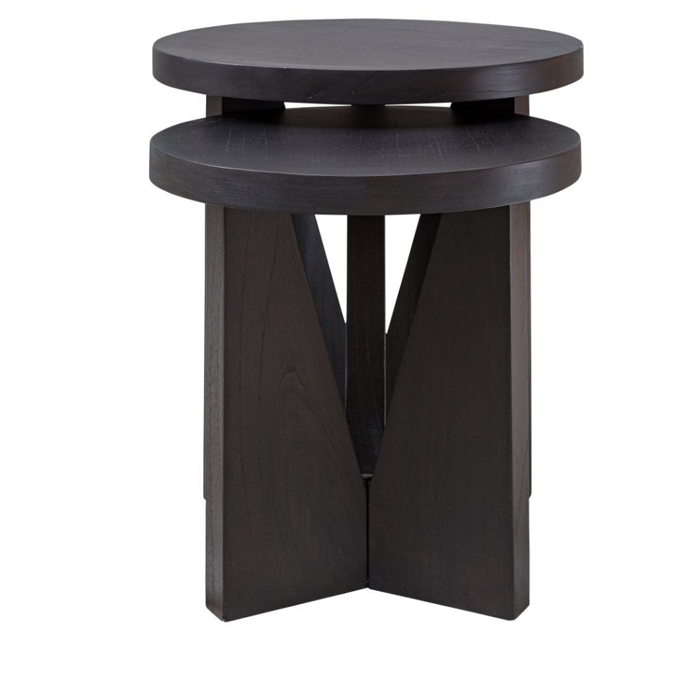 Modern and Sophisticated, This Set of Two Nesting Tables Features Strong Angular Lines and is Layered in Dark Espresso Finished Mindi Veneer. Sizes: Sm-16x19x16, Lg-18x22x18