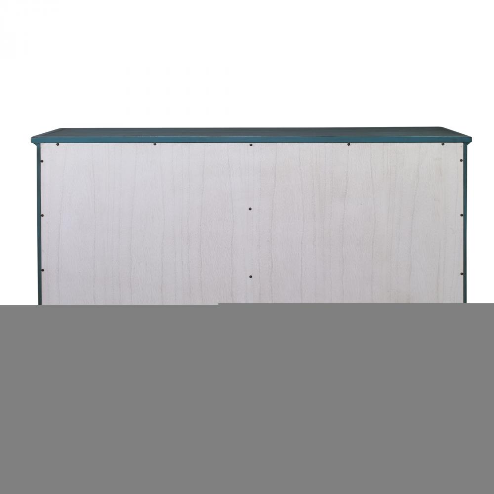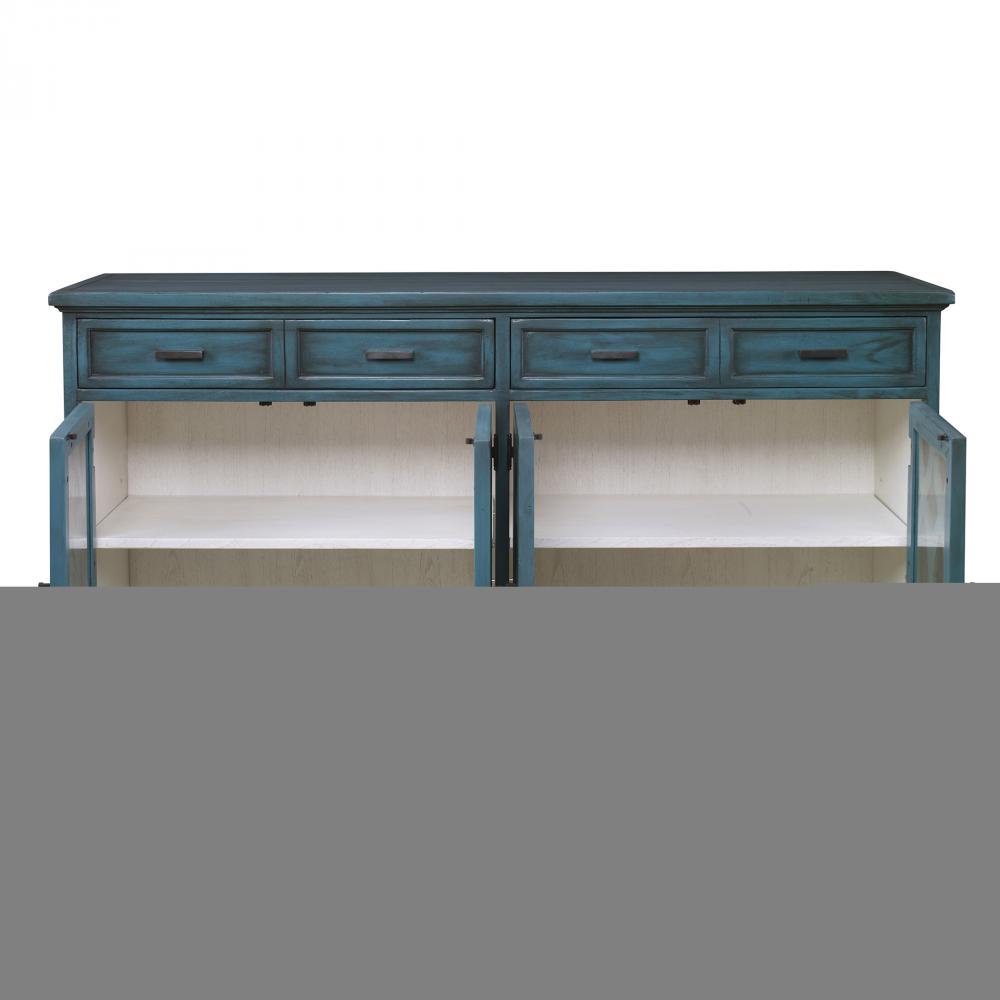 Featuring Solid Wood Construction, This Credenza Showcases Enhanced Cabinet Doors with Intricate Wooden Cutouts Over Glass. Finished in A Lagoon Green Exterior with A Contrasting Antique White Finished Interior and Accented with Coffee Bronze Finished Hardware. Open Shelf Styling Allows Versatility As A Sideboard or Media Console. Interior Shelves Are Adjustable.