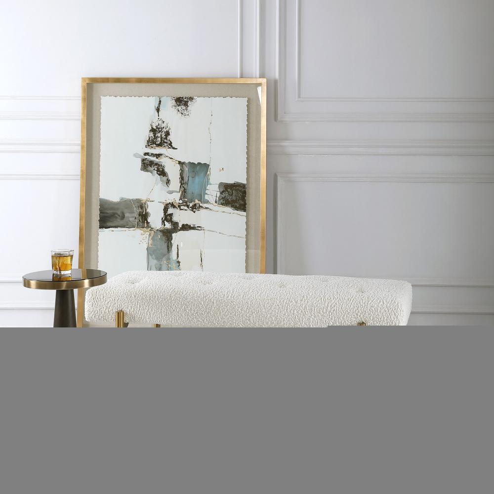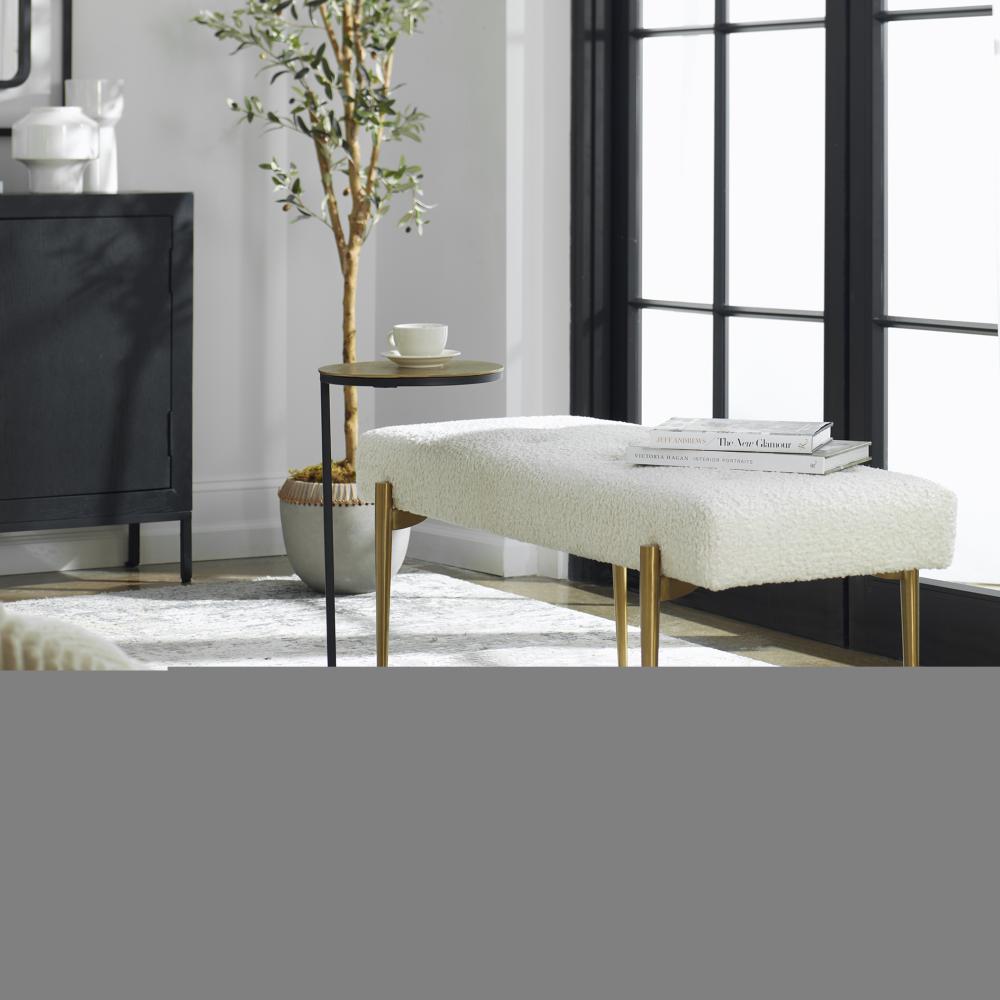Expertly Tailored in White Faux Shearling, This Glamorous Accent Bench Features A Plush Button Tufted Seat, Atop Four Tapered Stainless Steel Legs Finished in Antique Brushed Brass.