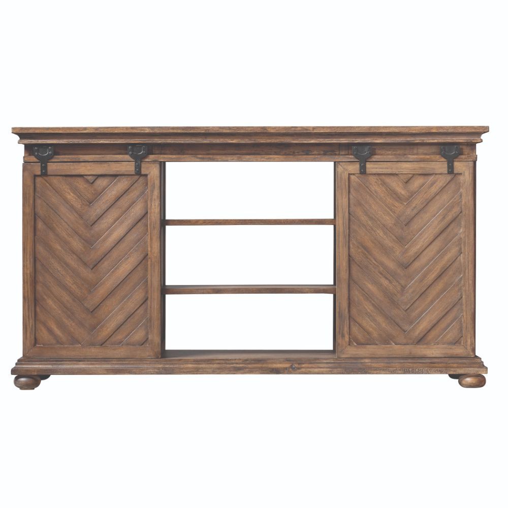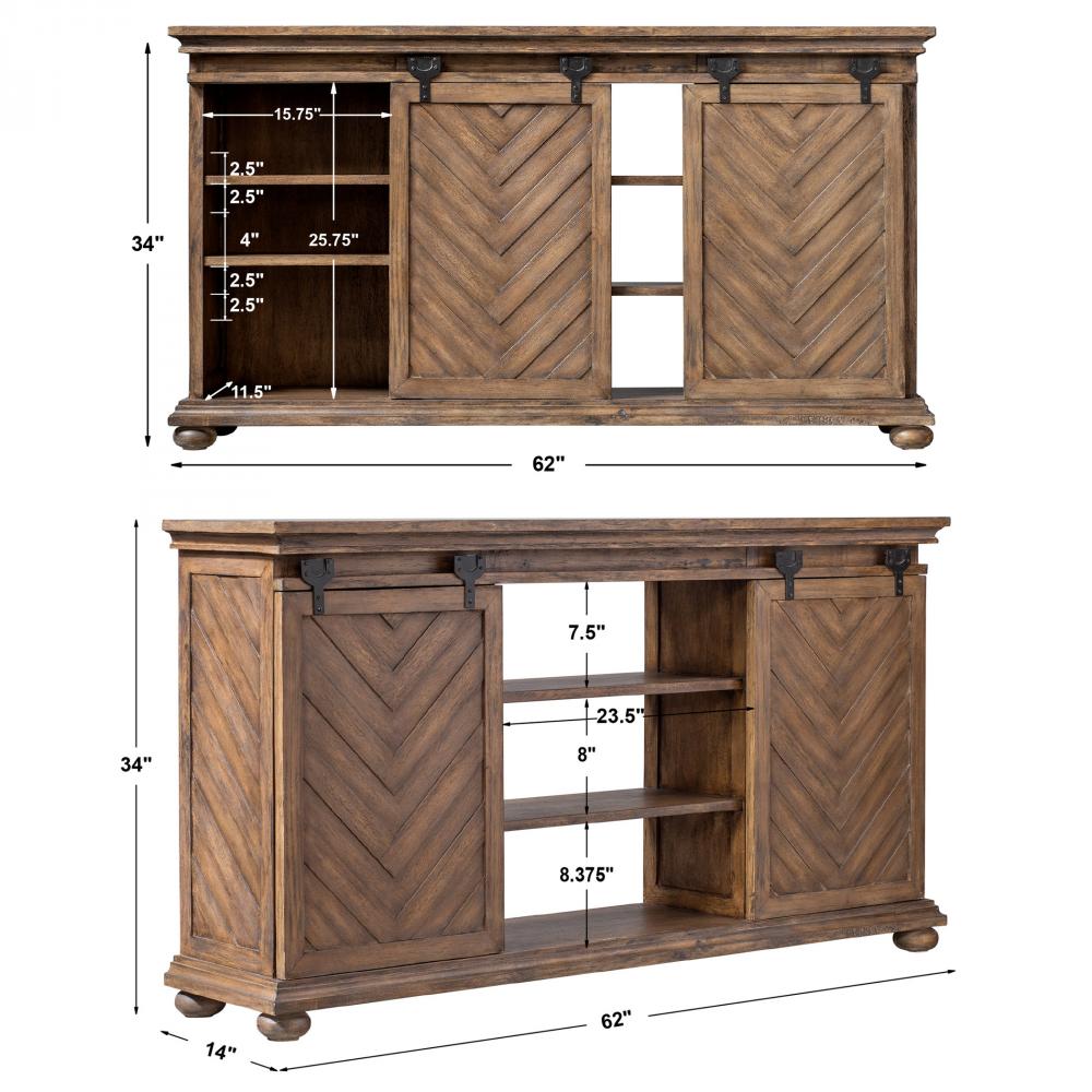 A Craftsman Built Media Piece Finished in Antique Honey Over Mango Veneer, Featuring Chevron Patterned Sliding Doors with Carved Molding Details and A Classic Bun Foot. Aged Black Iron Sliding Hardware Allows for Concealing or Revealing Multiple Storage Options. Each Side Has Two Adjustable Shelves, with Two Fixed Shelves in The Center.