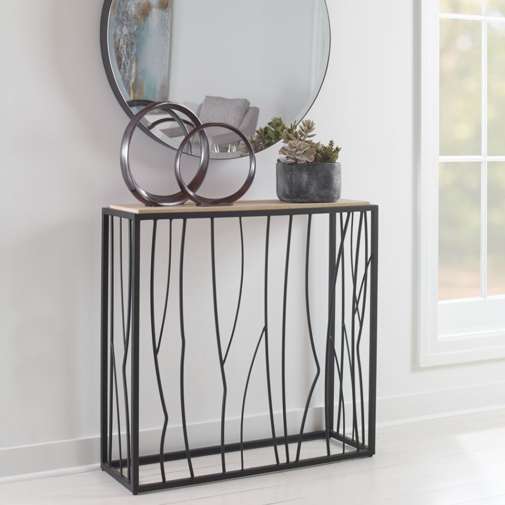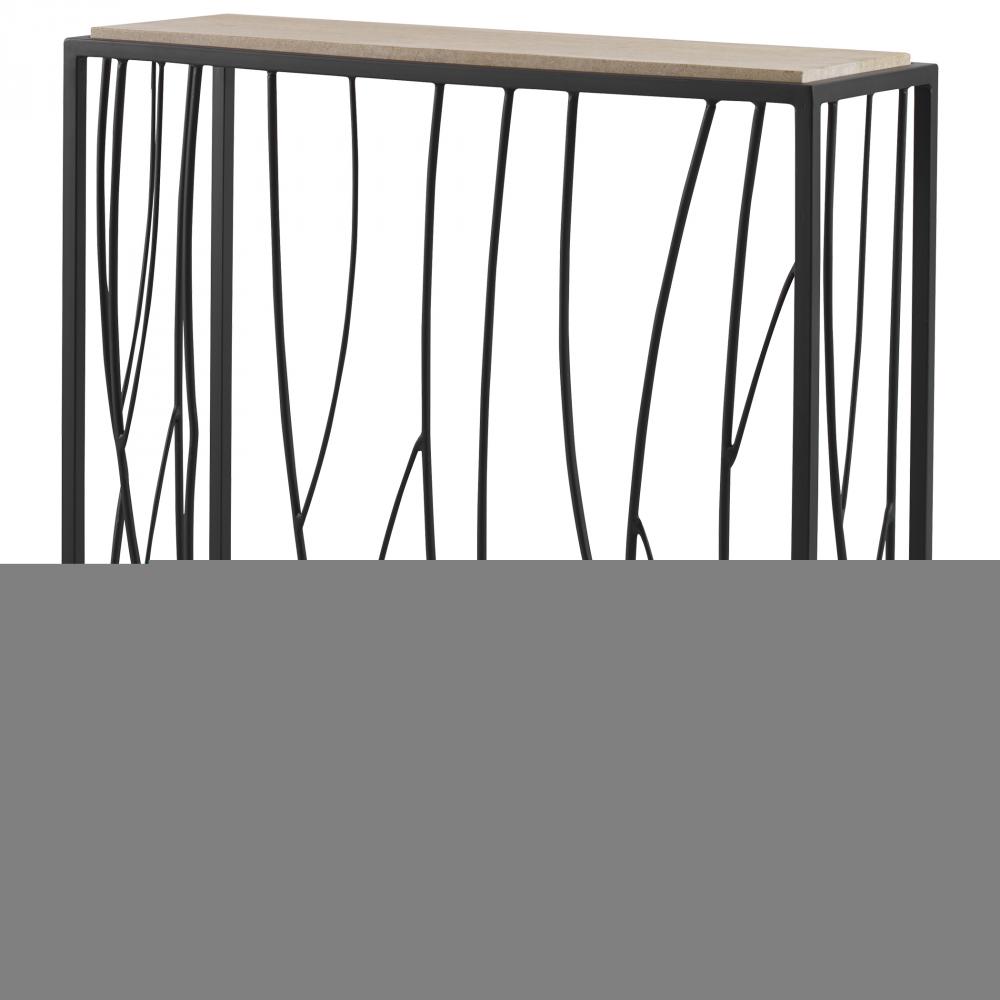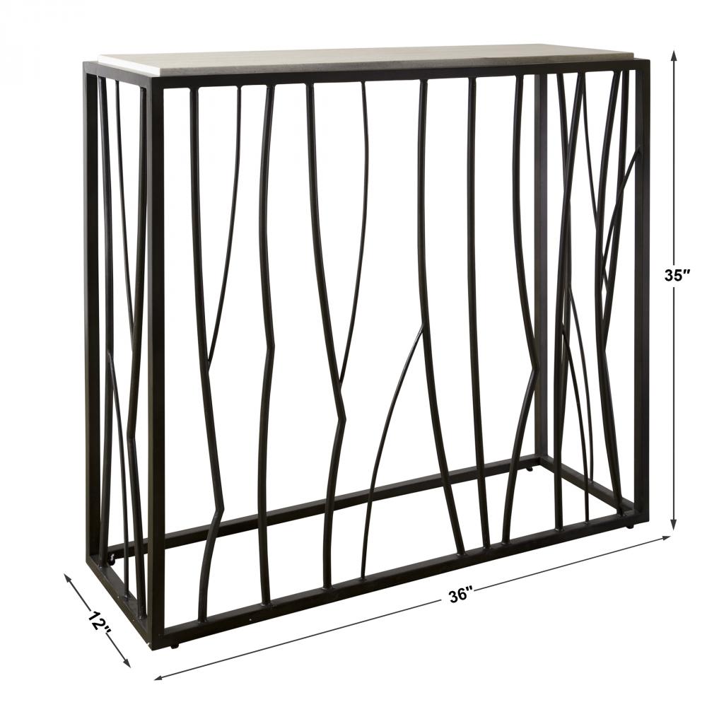 Inspired By Natural Landscapes, This Console Table Features An Asymmetrically Designed Metal Base Finished in Dark Iron Paired with A Natural Ivory Travertine Top. True to The Nature of Natural Materials, Each Piece Will Have Unique Marbling and Veining Throughout.