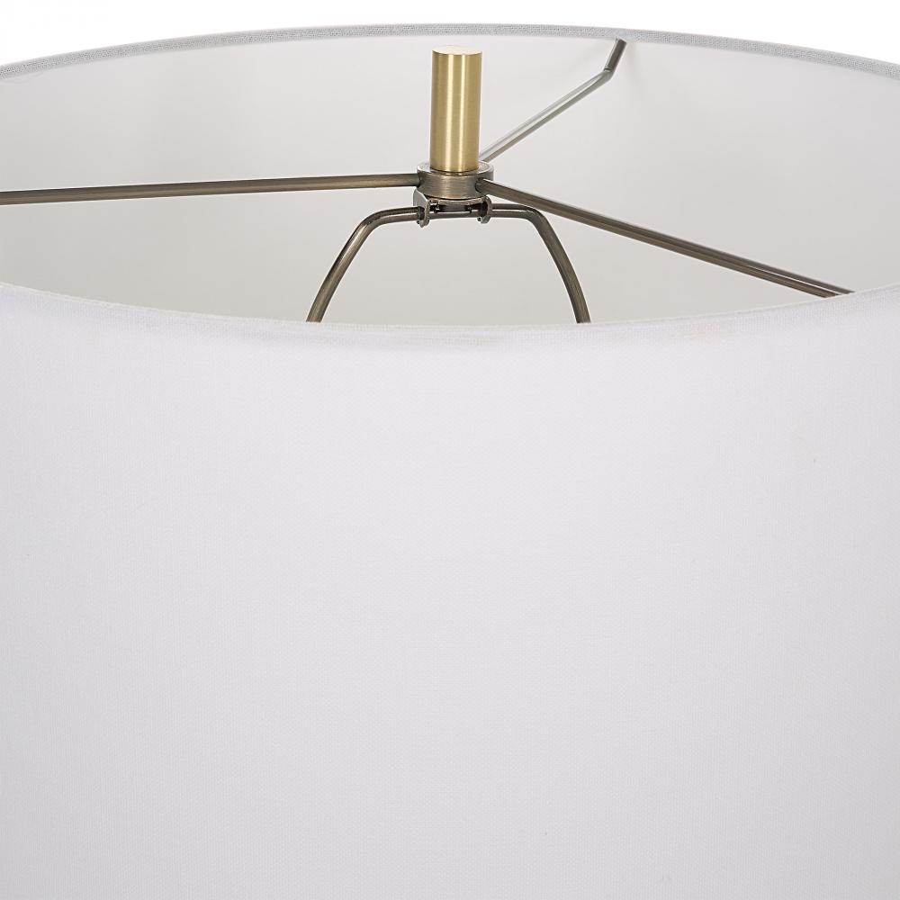 The Ruse Table Lamp Showcases A Whitewashed Wood Look with A Noticeable Textured Finish, Accented By Brushed Brass Plated Iron Details. Paired with A Hardback Drum Shade in A White Linen Fabric.