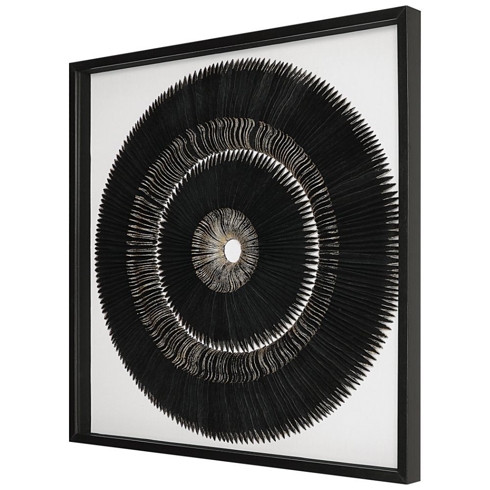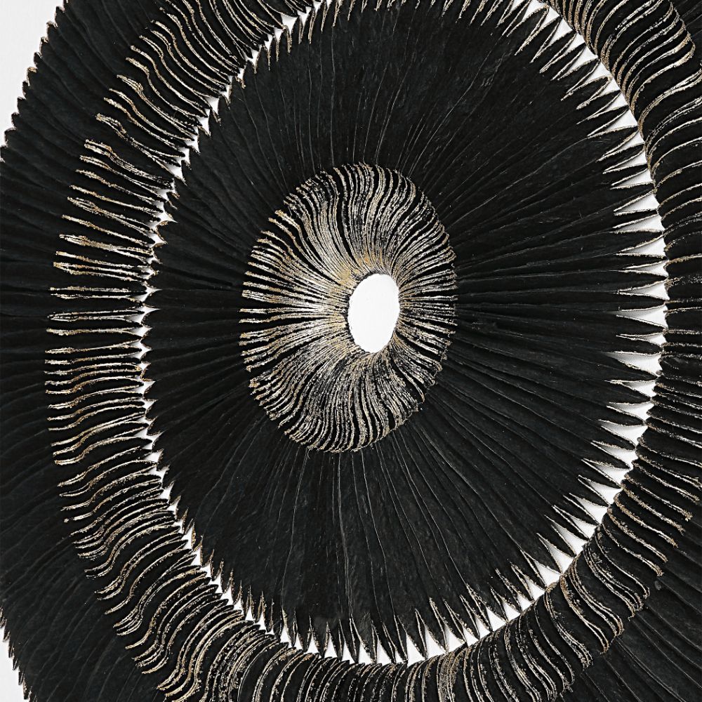 Handcrafted By Skilled Artisans, This Wall Decor Features A Striking Black and Gold Leaf Medallion. Artwork is Set Against A White Linen Backing in A Black Shadowbox Style Pine Wood Frame Under Glass.