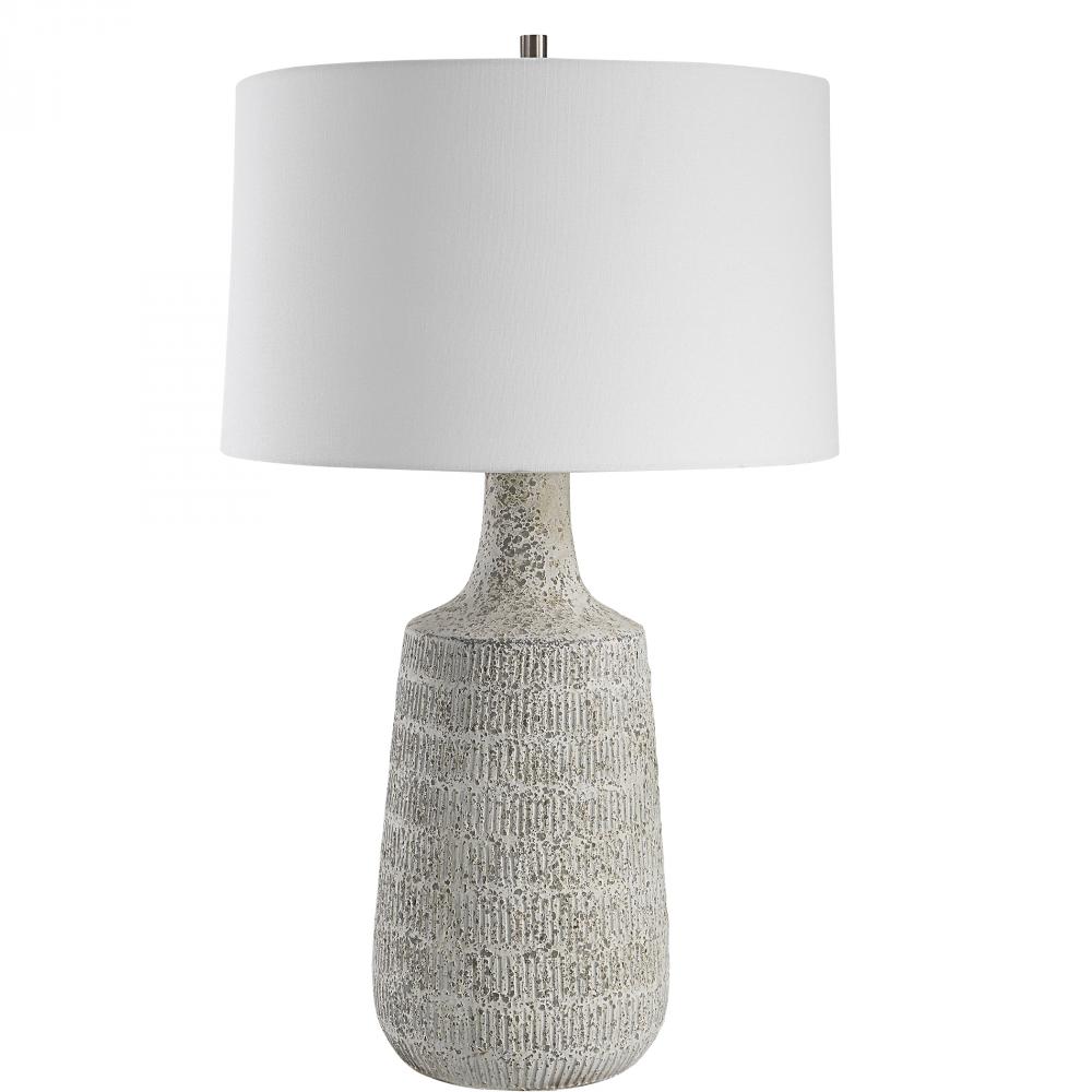 Drawing Inspiration From Antique Clay Pottery, This Table Lamp is Handcrafted From Ceramic in A Mottled Gray and Off-white Matte Glaze with Subtle Carved Details. Steel Accents Are Finished in Brushed Nickel. The Hardback Drum Shade is Covered in A Casual White Fabric.