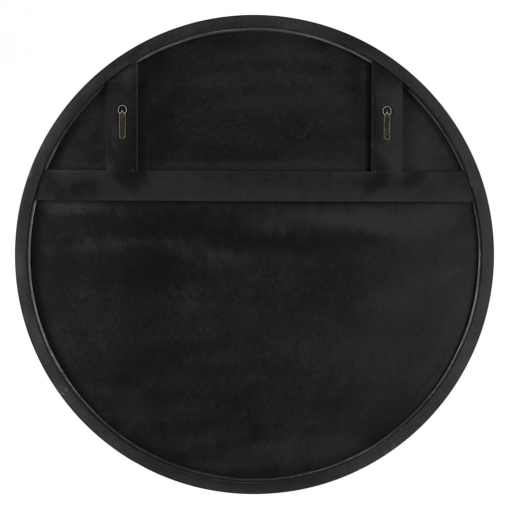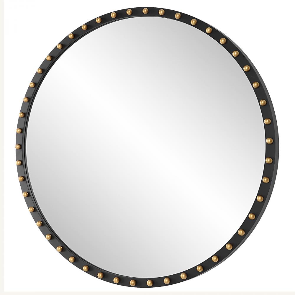 This Oversized Round Mirror is Made From Solid Beech Wood Finished in A Matte Black, Adorned with Lightly Distressed Gold Leaf Wood Ball Details.