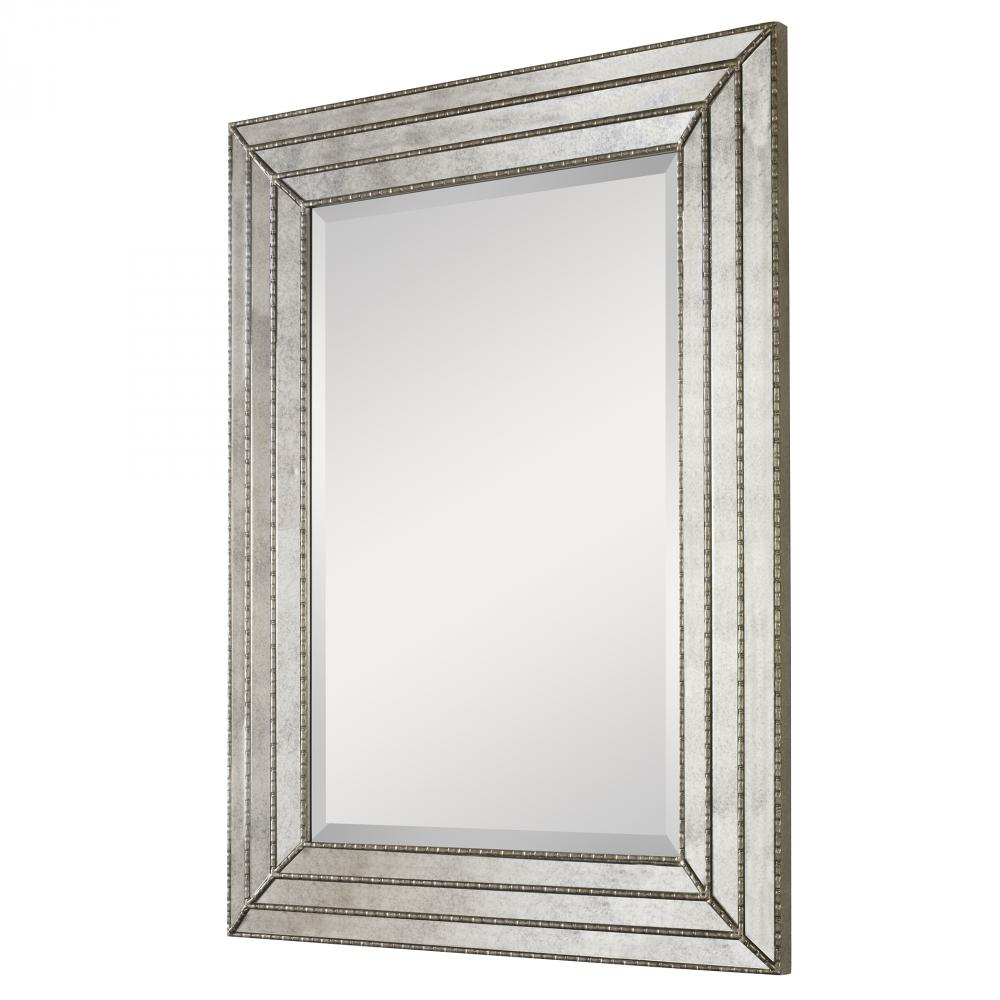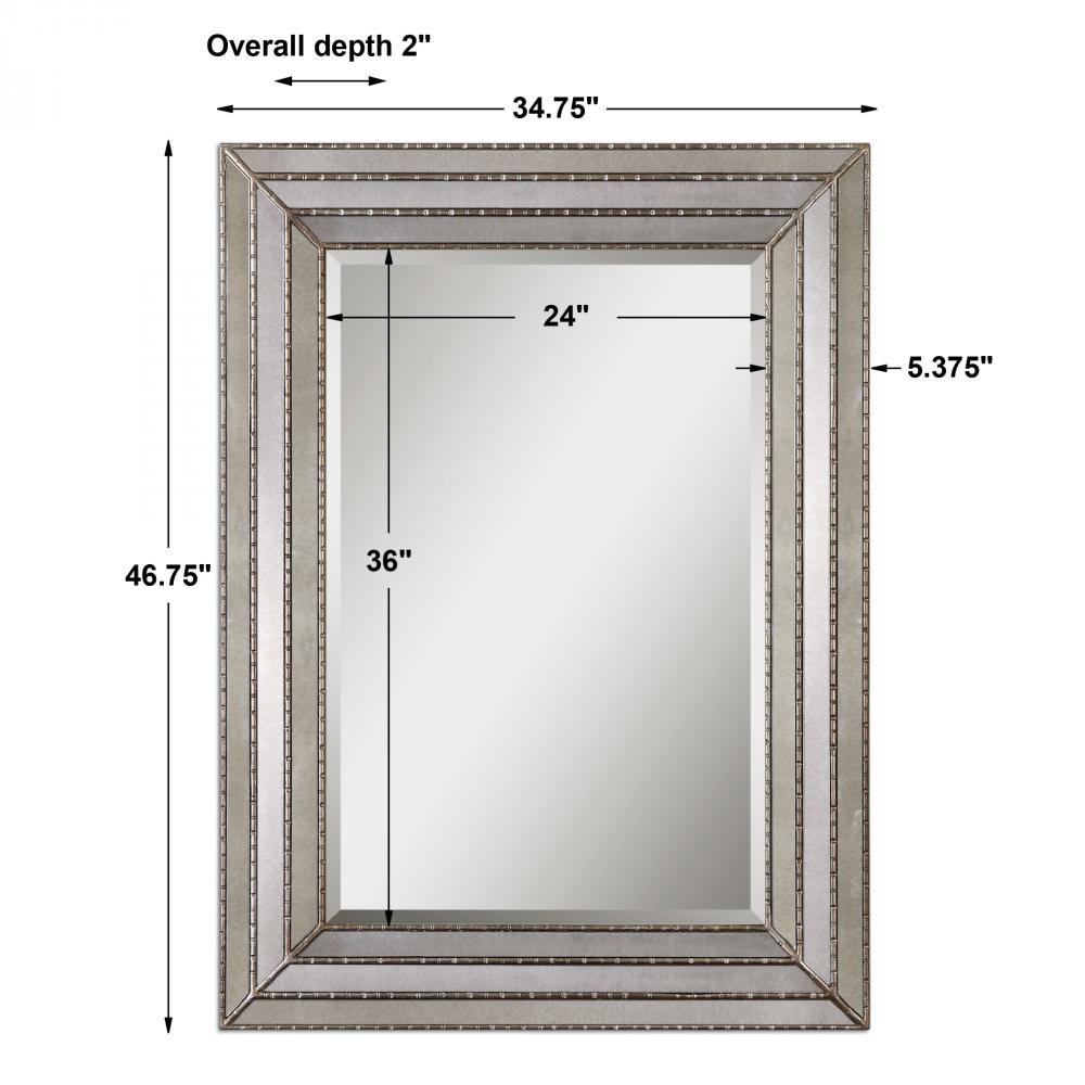 This Mirror Features A Frame Made of Antiqued Mirror Inlays with Burnished Silver Details. Center Mirror Features A Generous 1 1/4" Bevel. May Be Hung Horizontal or Vertical.