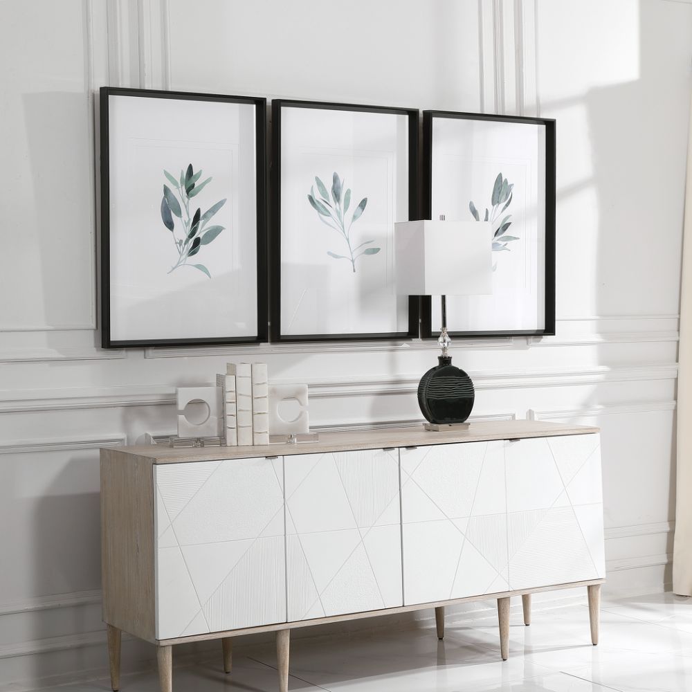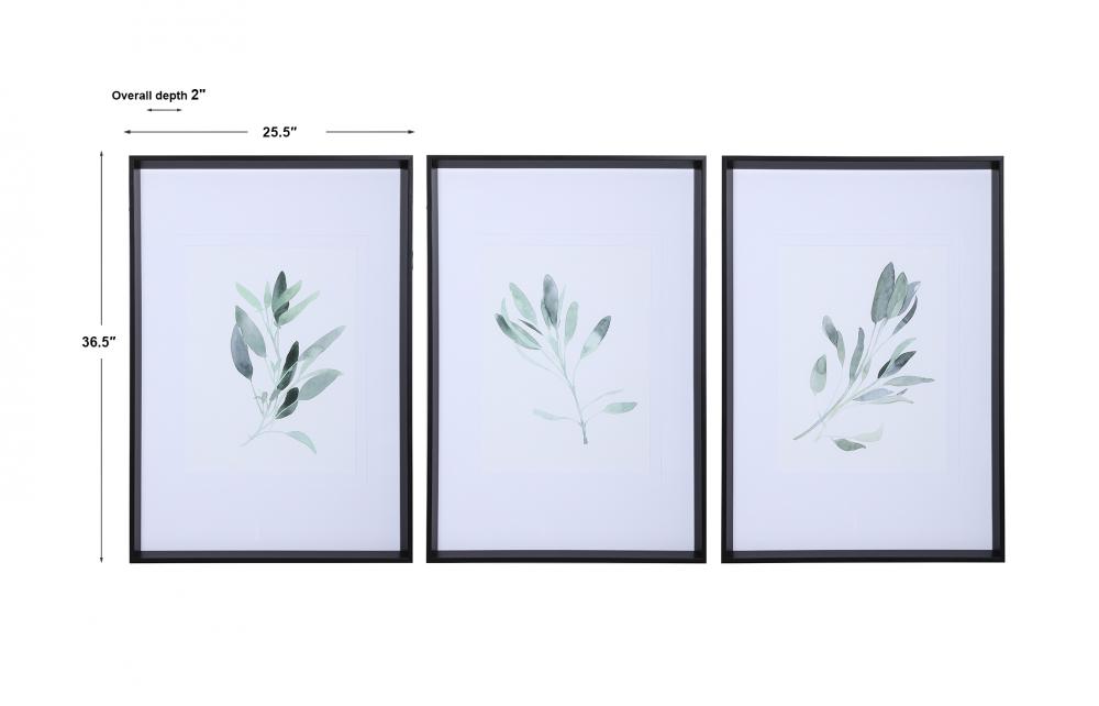 A Nod to Modern Farmhouse Style, This Set of Artwork Showcases Individual Sage Branches Printed in A Watercolor Style. Cool Shades of Green and Gray Blue Are Complemented By Elegant Double White Matting and A Petite Matte Black Frame, Under Glass. Artwork By Emma Scarvey.
