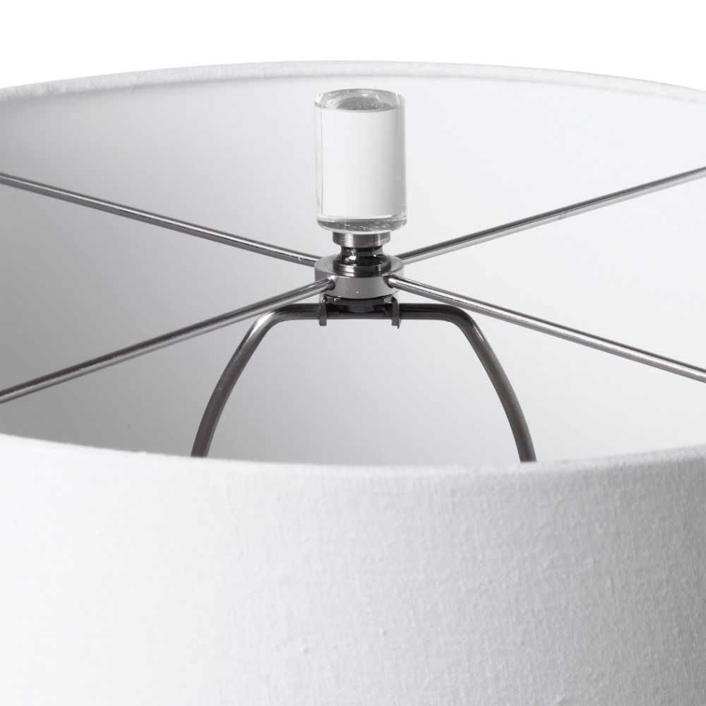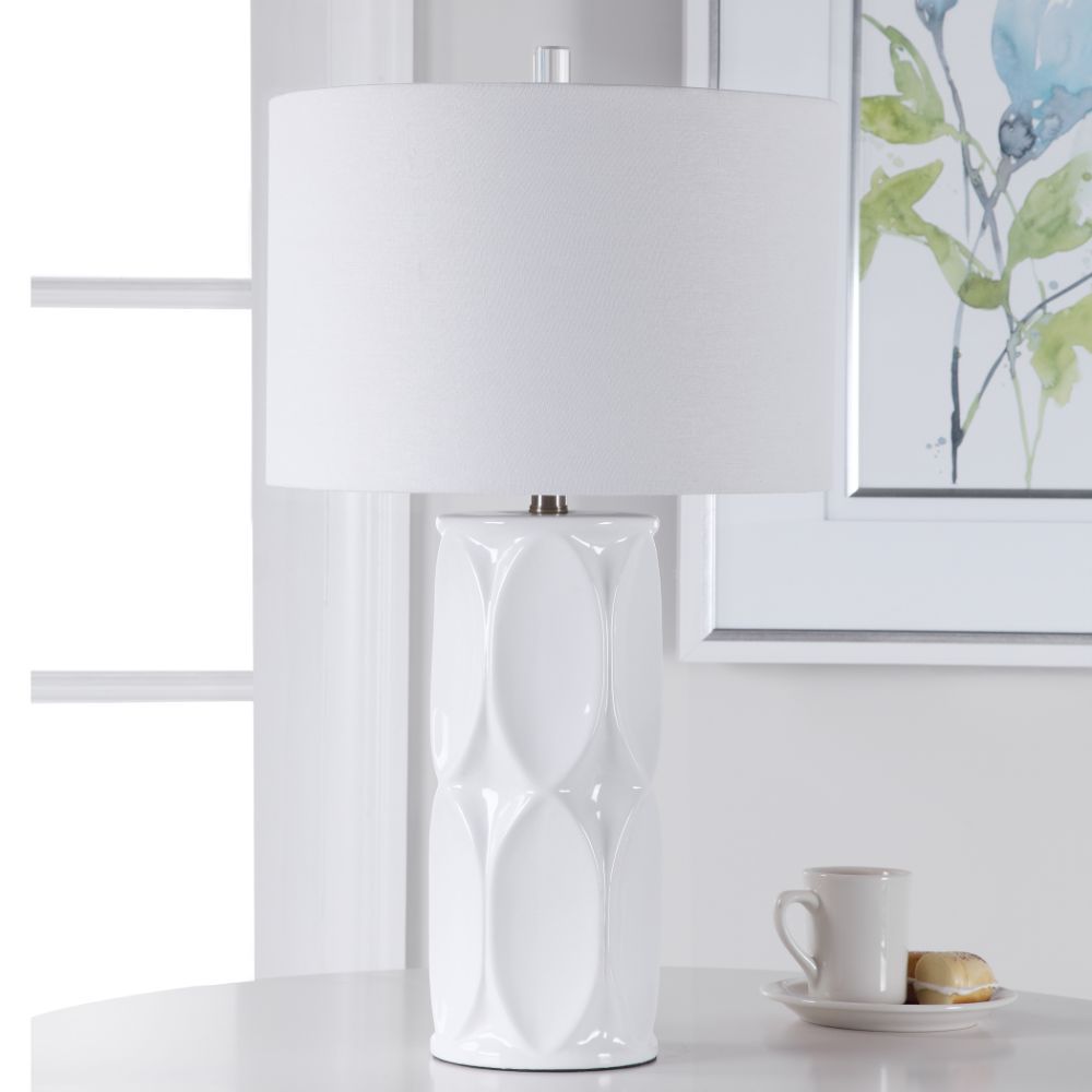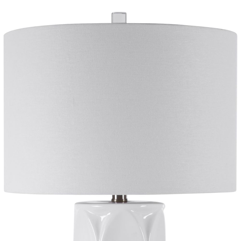 This Ceramic Table Lamp Showcases A Touch of Mid-century Style with A Dimensional Geometric Design Finished in A Glossy White Glaze, Accented with Brushed Nickel Neck and A Crystal Finial. The Lamp is Paired with A White Fabric Drum Shade.
