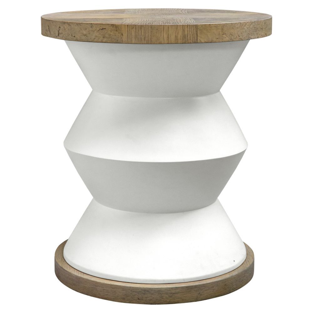 This Modern Side Table Showcases A Geometric Base Finished in Matte White. The Top Features A Light Honey Toned Stain Over An Oak Veneer Marquetry Pattern, with Burl Accents.