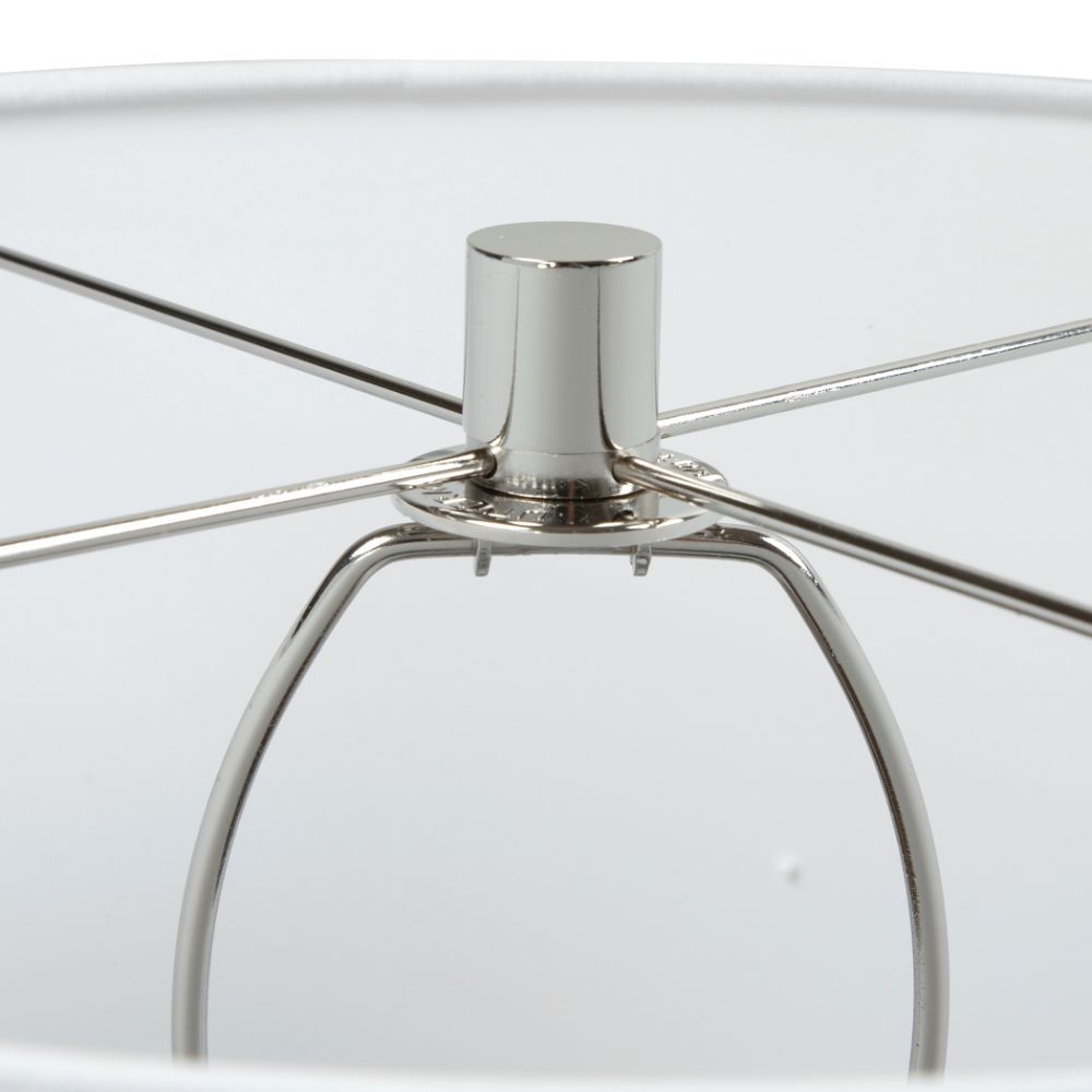 Reminiscent of The Evening Sky, This Beautiful Table Lamp Features An Art Glass Base with Shades of Navy, Cobalt and White Accented By An Elegant Crystal Foot and Polished Nickel Plated Details. A Crisp White Hardback Drum Shade Completes The Look.