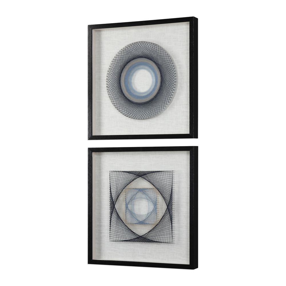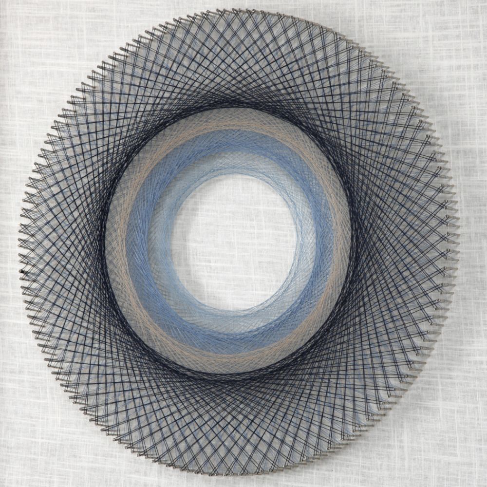 These Fun Shadow Boxes Feature 3-dimensional Layered String Art, Hand Threaded Around Individually Hammered Pin Nails in Easy Shades of Blue, Over A Neutral Linen Backing with A Black Pine Frame.