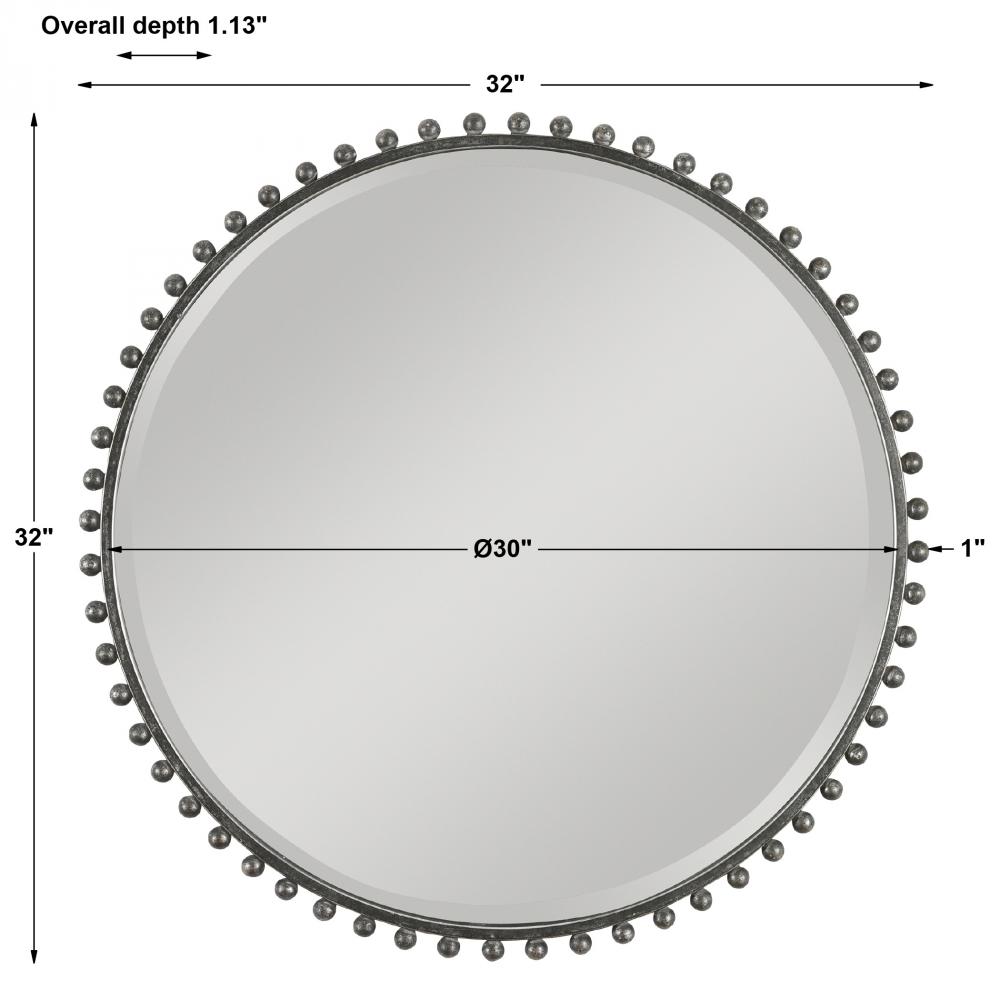 Petite Iron Spheres Line The Outer Edge of This Round Frame, Finished in A Distressed Black with Silver Highlights and A Light Gray Glaze. Mirror Features A Generous 1 1/4" Bevel.