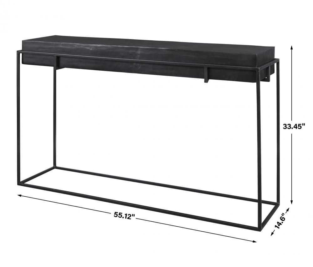 With Modern Minimalist Styling, This Console Table Features A Thick Cast Aluminum Top with Natural Texturing Finished in A Plated Antique Black, Resting in A Coordinating Aged Black Iron Base.