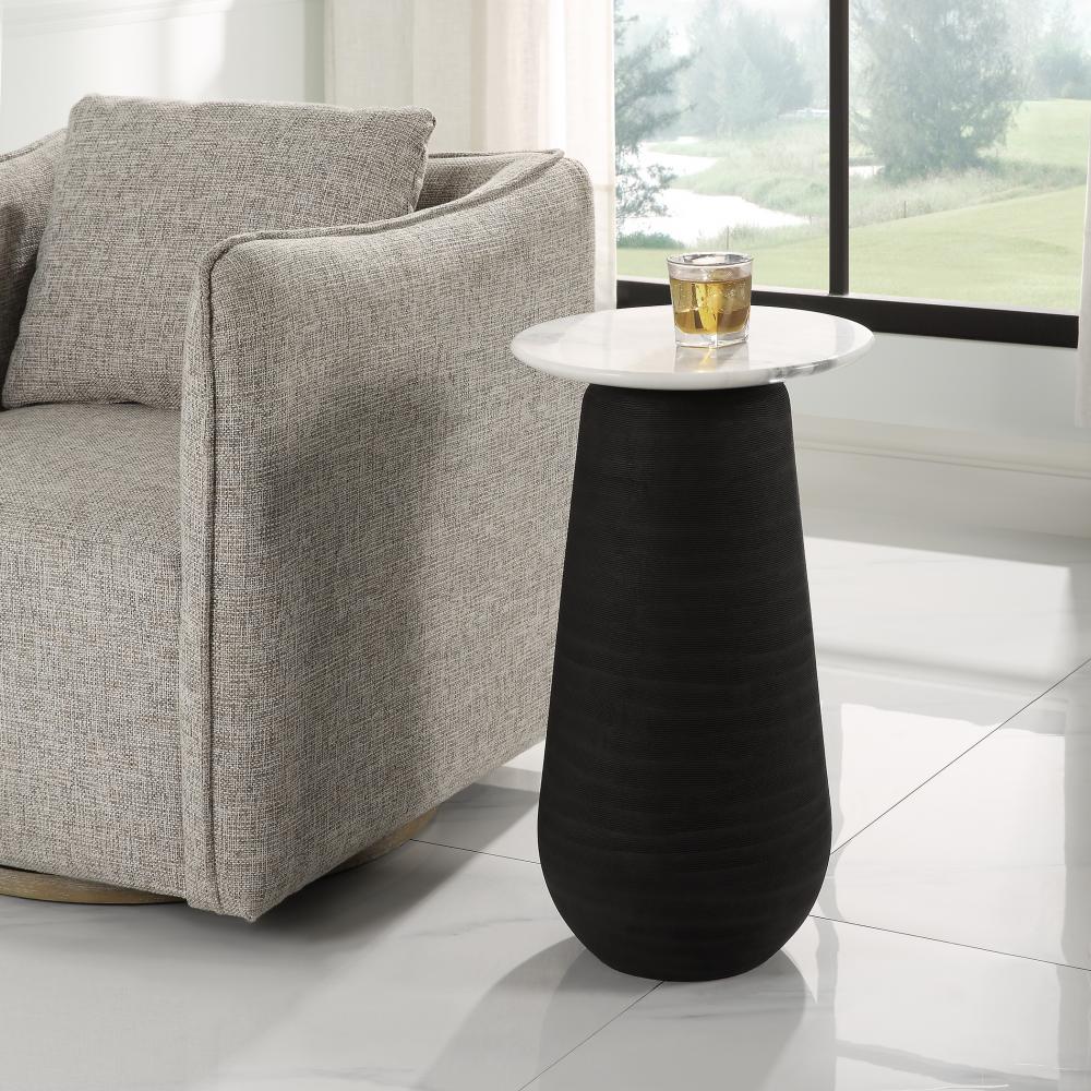 The Curved Forms of The Total Eclipse Accent Table Come Together Creating Juxtaposed Textures of Polished White Marble and Hand Etched Porcelain in Matte Black. Because of The Natural Characteristics of Marble, Each Piece Will Have Unique Veining Patterns.