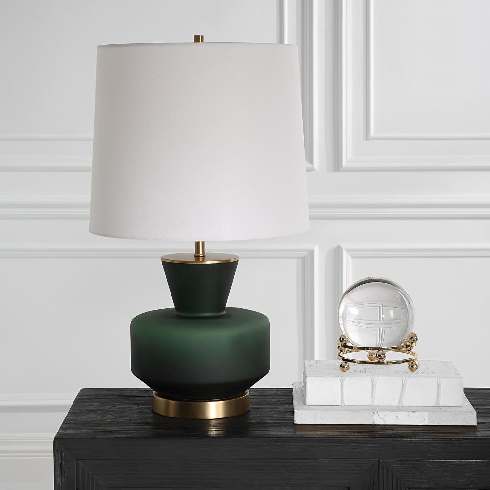 Inspired By Mid-Century Modern Design, This Table Lamp Features A Unique Dark Emerald Green Glass Base That's Accented with Lightly Antiqued Brass Plated Details. The Tapered Round Hardback Shade is Covered in A Crisp White Linen Fabric.
