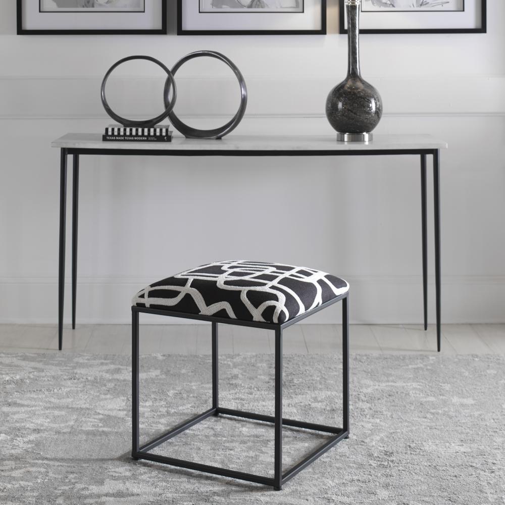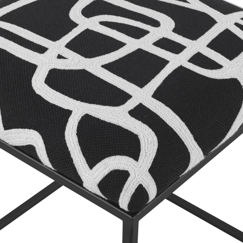 Sophisticated with A Touch of Whimsy, This Accent Stool Features A Cushioned Seat Upholstered in A Contemporary Black and White Embroidered Fabric, Atop A Matte Black Iron Base. Doubles As Added Seating or A Footrest.
