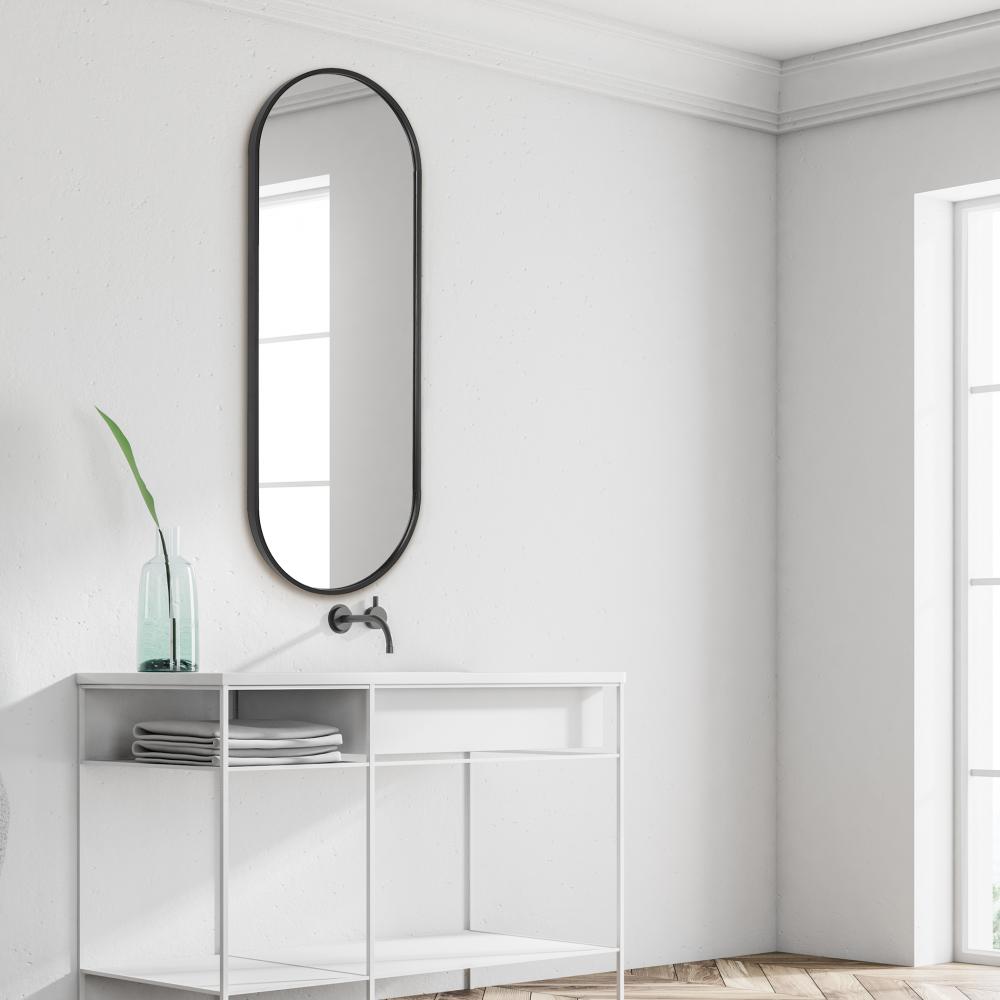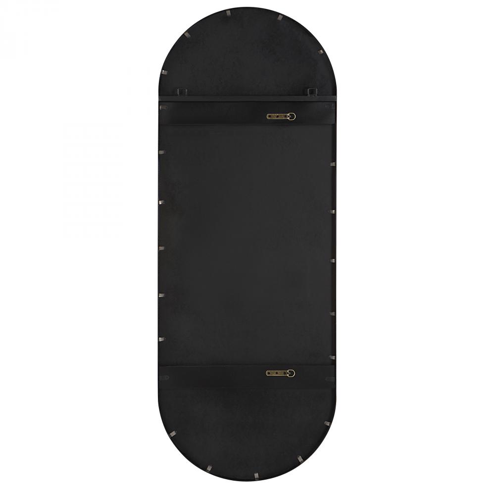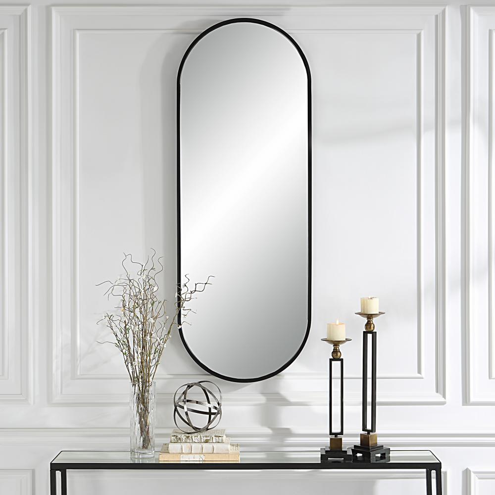 This Iron Oval Features A Sleek Satin Black Finish and Linear Details. May Be Hung Horizontal or Vertical.