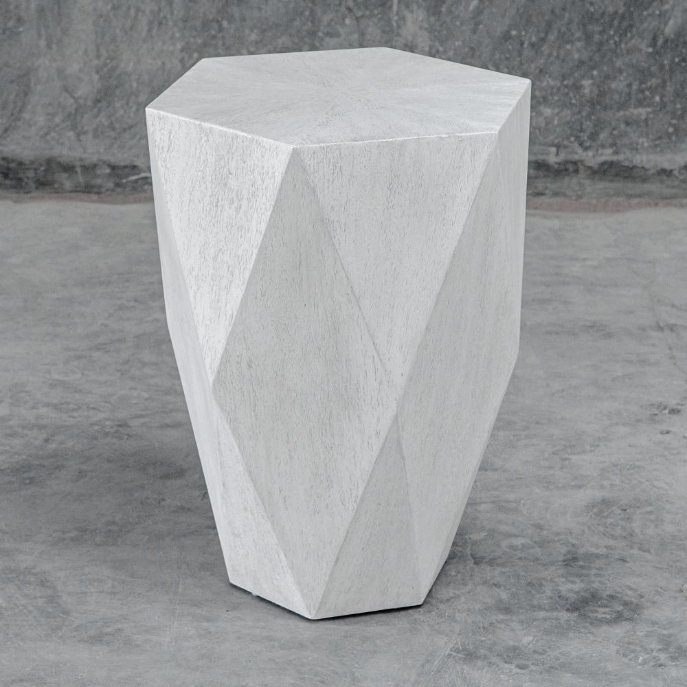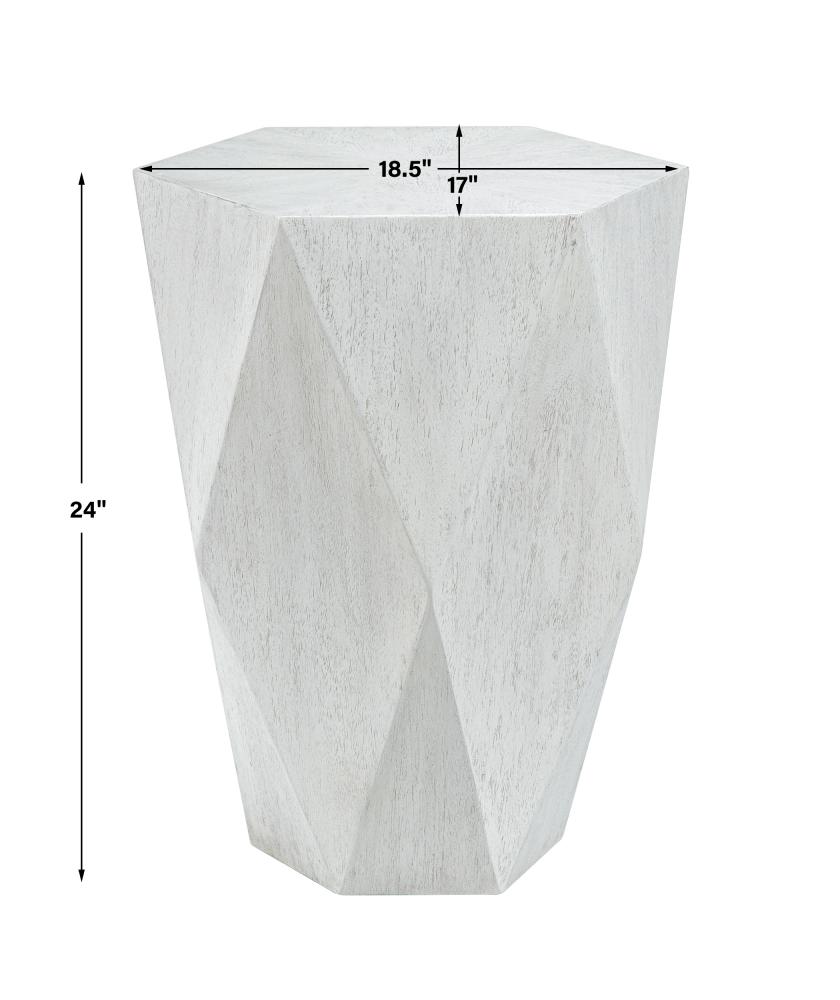 This Unique Geometric Side Table Features A Sunburst Top in Mango Veneer in A Fresh White Ceruse Finish.