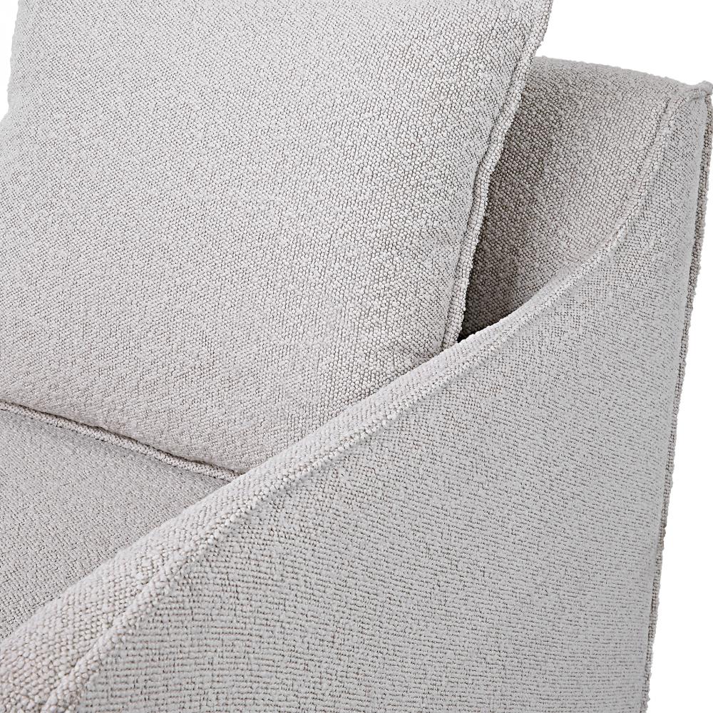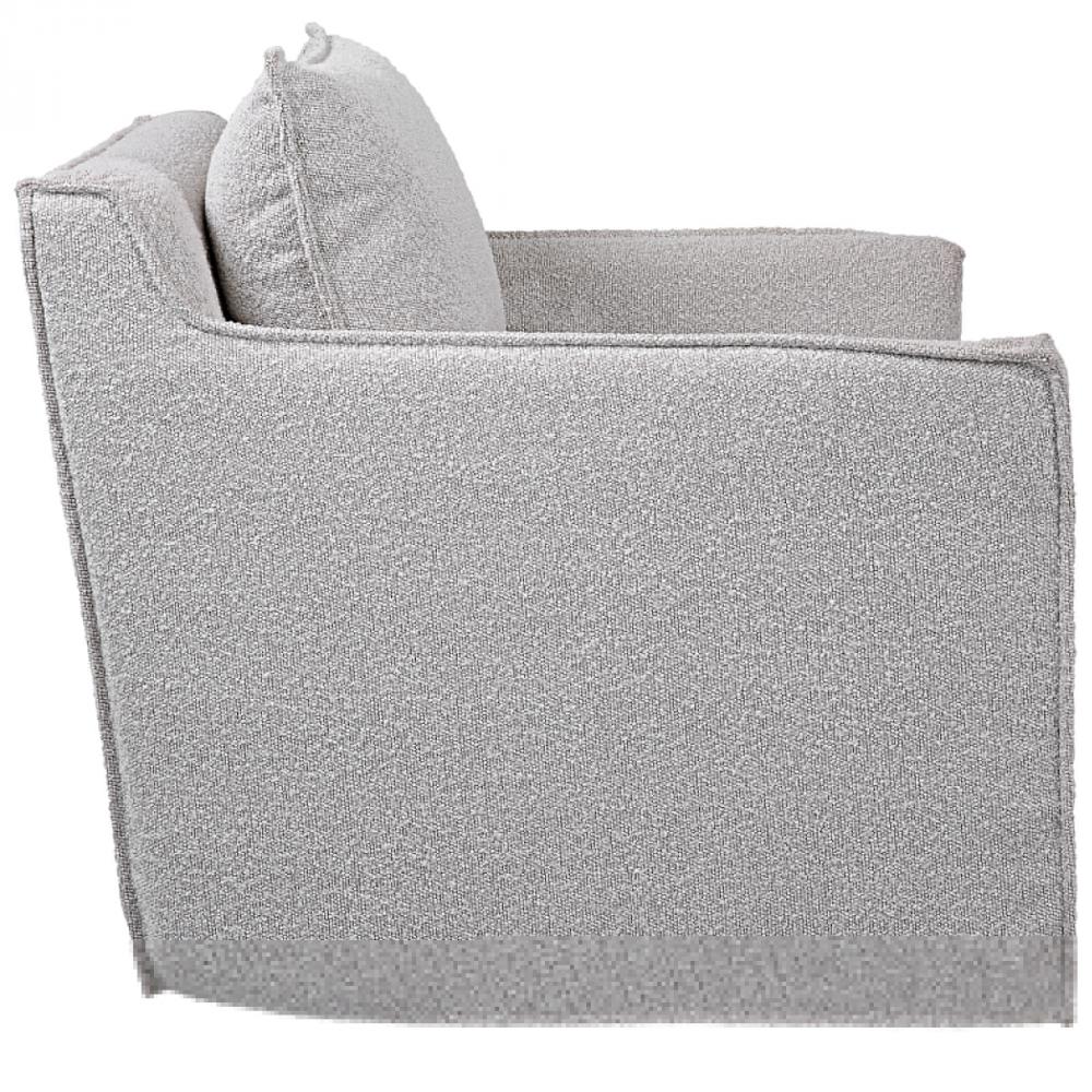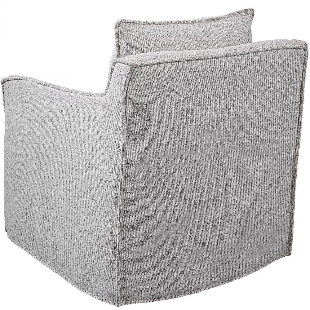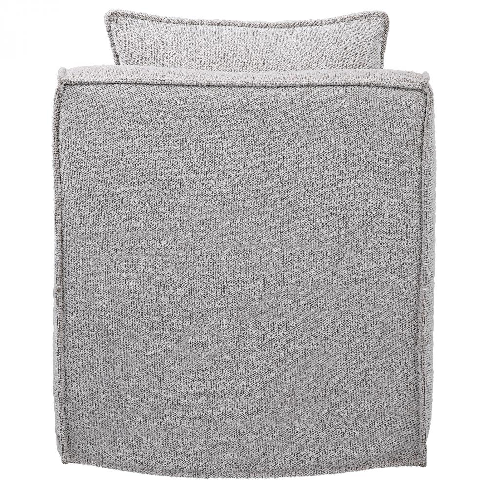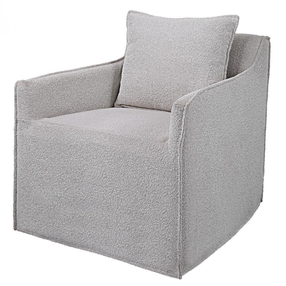 Casual Swivel Accent Chair Features A Tailored Slipcover Made From Ivory and Warm Gray Boucle Fabric with Flanged Edges and A Matching Square Pillow. The Hardwood Swivel Base is Finished in A Natural Ceruse. Seat Height is 18".
