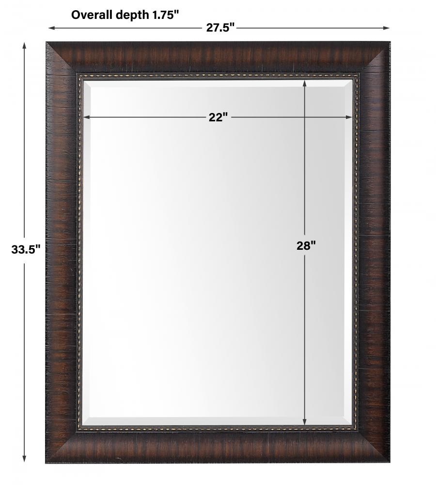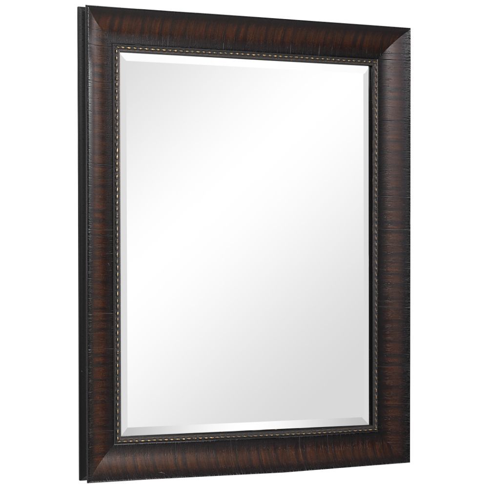 This rectangular mirror features a heavily burnished wood look with rich mahogany undertones, faux exposed wood grain and a beaded inner liner. The piece has a 1" bevel and may be hung horizontal or vertical.