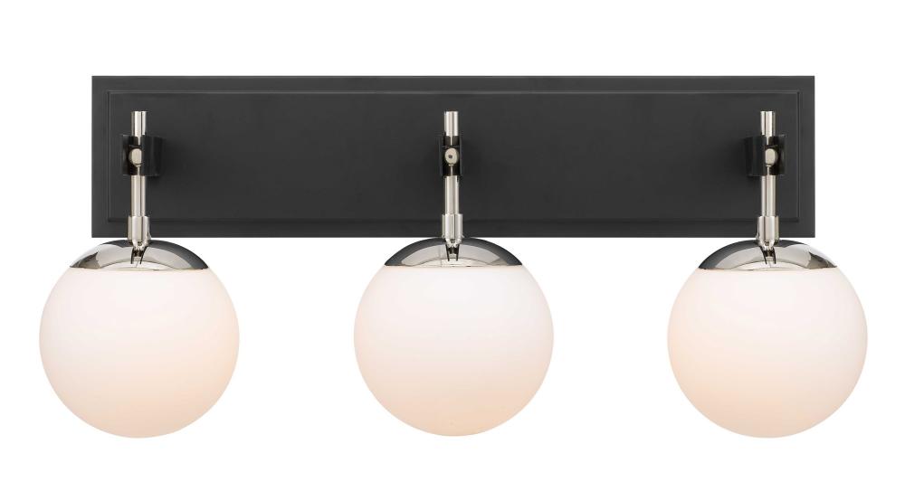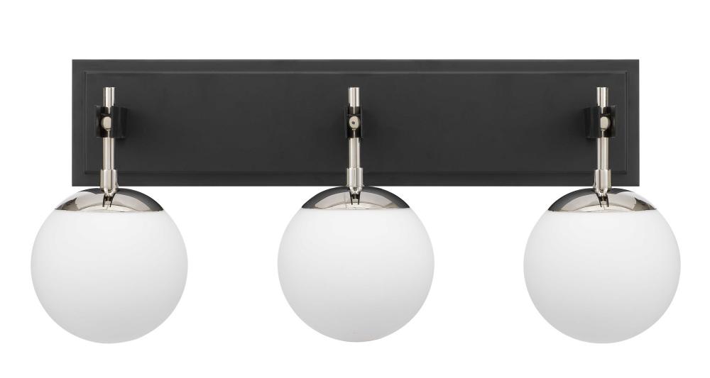 Mid-Century and Post Modern Design Influences. Gorgeous White Recycled Glass Globes. Easy Re-lamping. Two Tone Satin Black with Brass or Polished Nickel with Black Finshes.