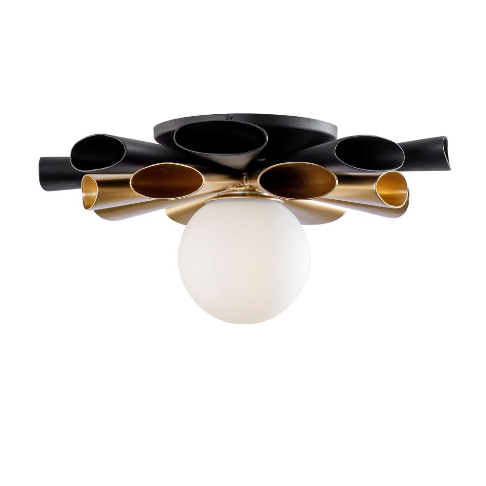 Hand-forged Tapered Oval Tubing. Hand-applied Matte Black and French Gold. Recycled Opal White GLass Globe