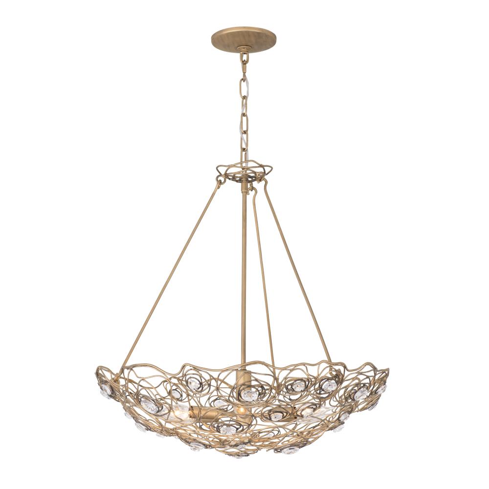 A rose is a rose is a rose, until of course, it is reimagined by Varaluz. Inspired by a drawing that appeared in the Japanese design magazine, Shin-Bijutsukai (New Oceans of Art), Ethereal Rose marries swirling lines of varying thicknesses and irregular curves with a mid-century metal work technique. At the center of each rose is a multi-faceted round optic quality crystal element. The hanging stems and secondary canopy complete the wispy design motif. A Havana Gold hand-painted multi-layered finish features a unique ombre that gets darker with additional antiquing around the crystal centers.