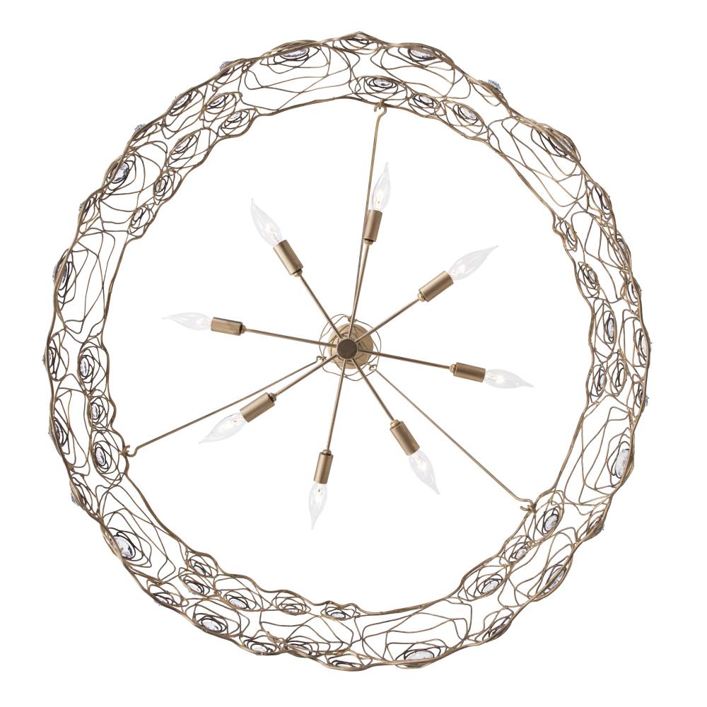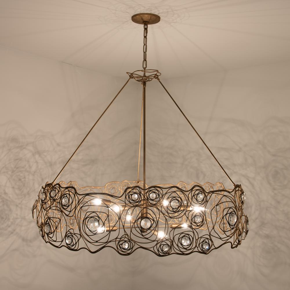 A rose is a rose is a rose, until of course, it is reimagined by Varaluz. Inspired by a drawing that appeared in the Japanese design magazine, Shin-Bijutsukai (New Oceans of Art), Ethereal Rose marries swirling lines of varying thicknesses and irregular curves with a mid-century metal work technique. At the center of each rose is a multi-faceted round optic quality crystal element. The hanging stems and secondary canopy complete the wispy design motif. A Havana Gold hand-painted multi-layered finish features a unique ombre that gets darker with additional antiquing around the crystal centers.